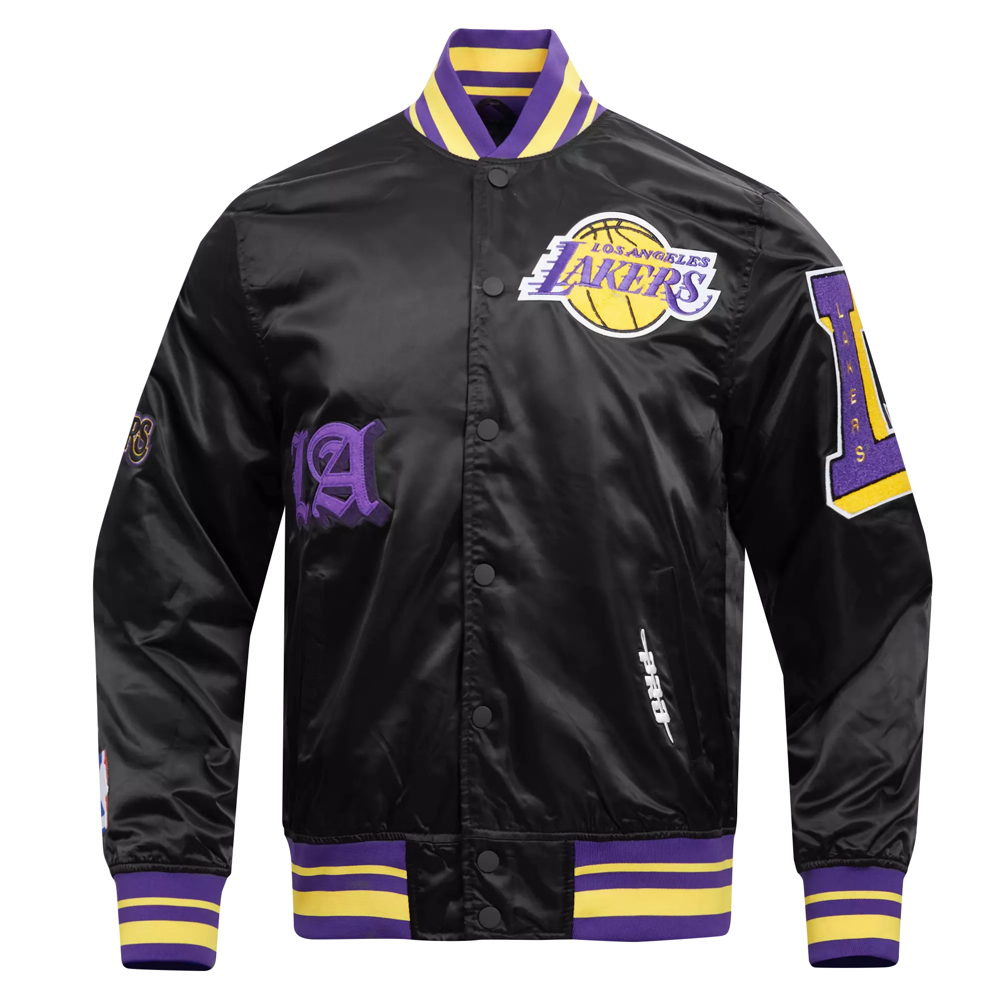 • Pro Standard Men's NBA Los Angeles Lakers Old English Logo Satin Varsity Jacket - Black/Purple - BLACK/PURPLE