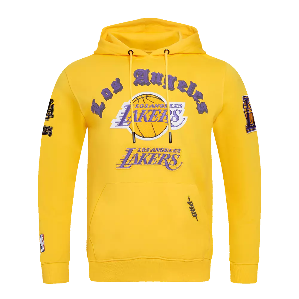 Athletic competition dates back. The Old English Capsule features the Renaissance-esque typeface alongside team emblems. Display your loyalty, feel like fan royalty, and conquer the day's look. This yellow Pro Standard Men's NBA Los Angeles Lakers Old English PO Hoodie is our most comfortable cotton double knit hoodie that features elevated team logo patches. Pure sophistication!Features