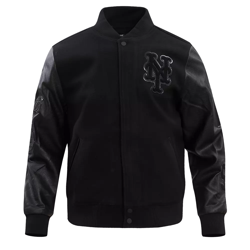 Pro Standard Men's New York Mets Triple Black Wool Varsity JacketThe Pro Standard Men's New York Mets Triple Black Wool Varsity Jacket will make you stand out from the crowd. The midweight jacket will keep you comfortable when the temperature drops thanks to the jacket’s stand -up collar quilted lining and full-zip front. Various pockets offer storage for all essentials. This stylish jacket features faux leather sleeves and base felt chenille team logo patches, and 3D embroidery, making it the perfect choice for any fashion-savvy individual.