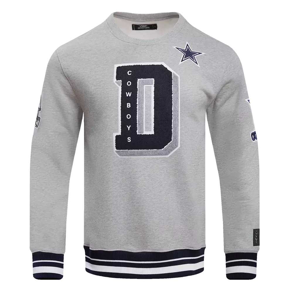 Better together. If you can’t decide which team logo is the vibe of the day, then don’t. The Mashup Capsule does the forbidden by combining team artwork from different eras into one piece. Remix it, and press play.This grey & navy Pro Standard Men's NFL Dallas Cowboys Mashup Rib Crewneck sweatshirt is made from 100% brushed back cotton fleece for maximum comfort.