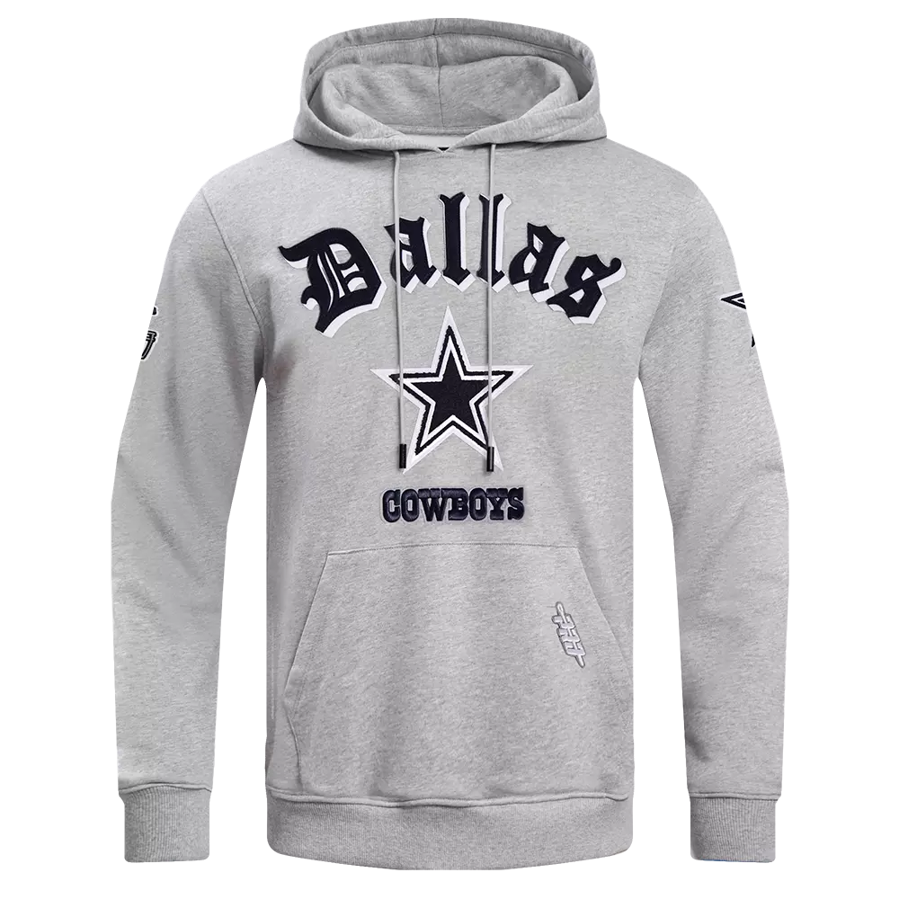 Athletic competition dates back. The Old English Capsule features the Renaissance-esque typeface alongside team emblems. Display your loyalty, feel like fan royalty, and conquer the day's look. This Pro Standard Men's NFL Dallas Cowboys Old English Pullover Hoodie - Grey is our most comfortable cotton double knit hoodie that features elevated team logo patches. Pure sophistication!Features