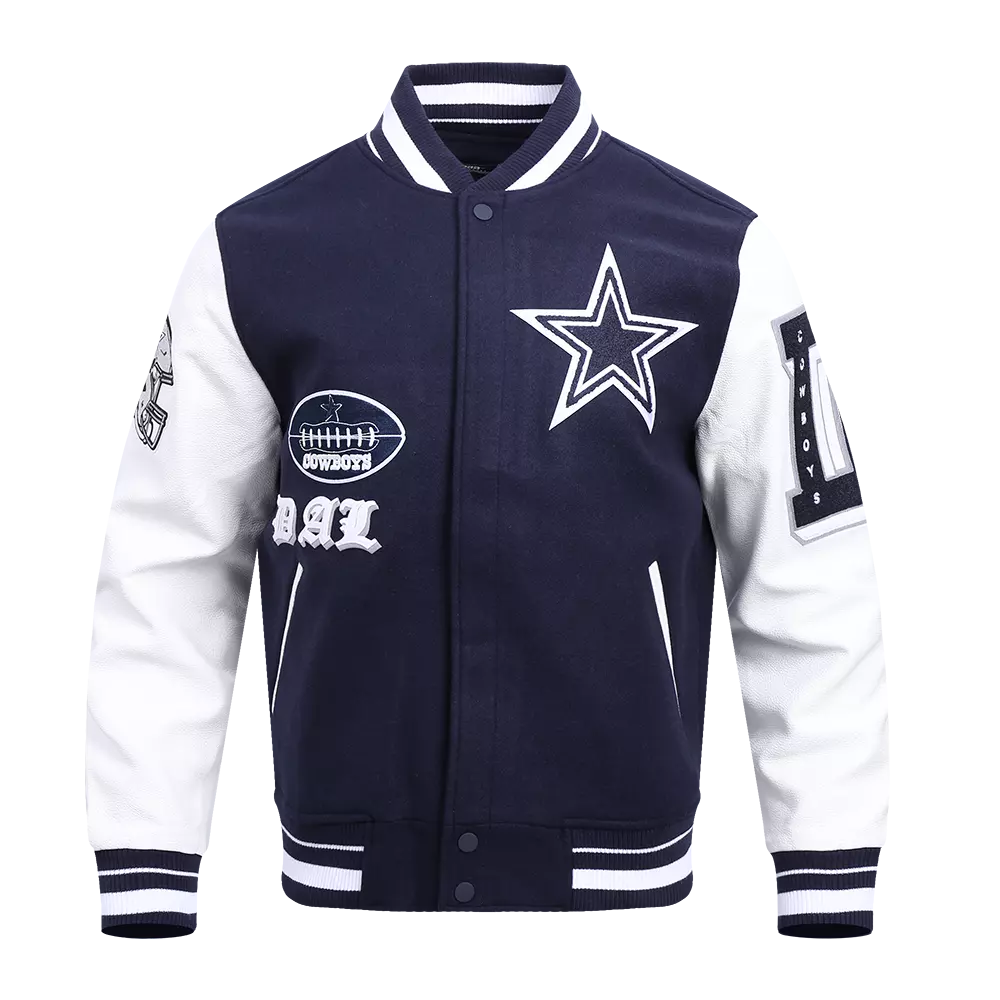 Athletic competition dates back. The Old English Capsule features the Renaissance-esque typeface alongside team emblems. Display your loyalty, feel like fan royalty, and conquer the day's look. This navy &white Pro Standard Men's NFL Dallas Cowboys Old English Rib Wool Varsity Jacket will make you stand out from the crowd. The midweight jacket will keep you comfortable when the temperature drops thanks to the jacket’s stand -up collar quilted lining and full-zip front. Various pockets offer storage for all essentials. This stylish jacket features faux leather sleeves and elevated team logos.