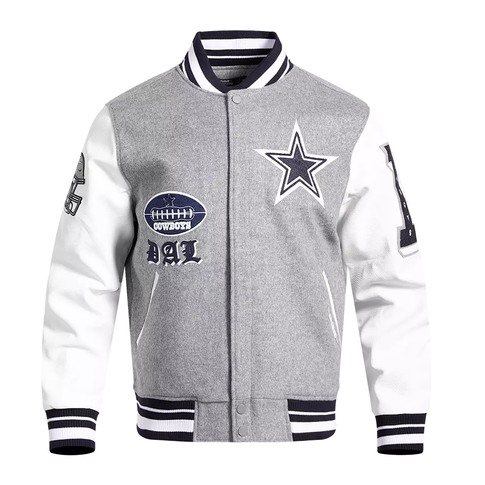 Athletic competition dates back. The Old English Capsule features the Renaissance-esque typeface alongside team emblems. Display your loyalty, feel like fan royalty, and conquer the day's look. This grey & white Pro Standard Men's NFL Dallas Cowboys Old English Rib Wool Varsity Jacket will make you stand out from the crowd. The midweight jacket will keep you comfortable when the temperature drops thanks to the jacket’s stand -up collar quilted lining and full-zip front. Various pockets offer storage for all essentials. This stylish jacket features faux leather sleeves and elevated team logos.Features