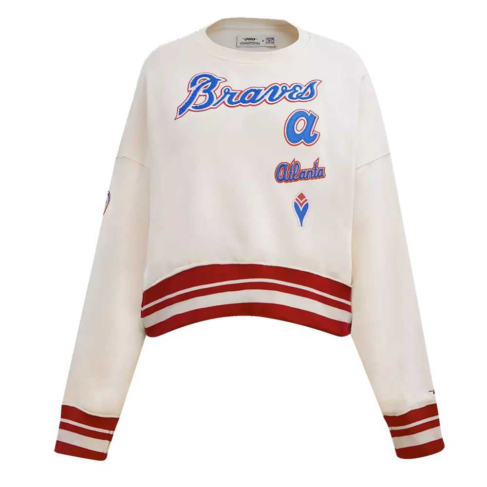 Introducing your new staple crewneck. This Pro Standard Women's Atlanta Braves Retro Classics Crewneck - Eggshell features embroidered team graphics paired with contrast trims for a striking look, finished off with ribbed trims constructed on premium cotton for maximum comfort.Features