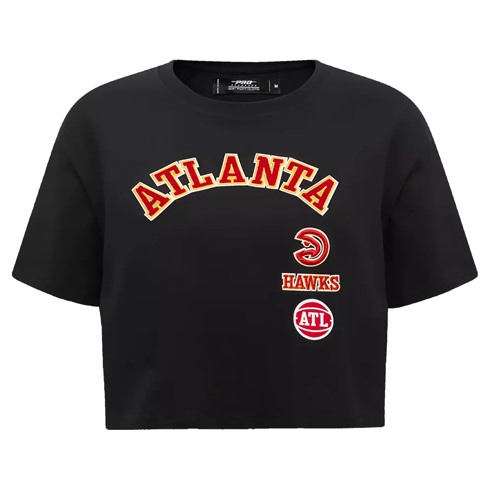 The Pro Standard Women's Atlanta Hawks Retro Classic Boxy Tee - Black is made from single jersey cotton and features base twill 3D satin Stitch embroidery and premium team logo patches. The combination of these elements creates a unique and eye-catching shirt that is sure to turn heads. Whether you're dressing up for a night out or just looking for a cool new casual shirt, our tee is the perfect choice.Features