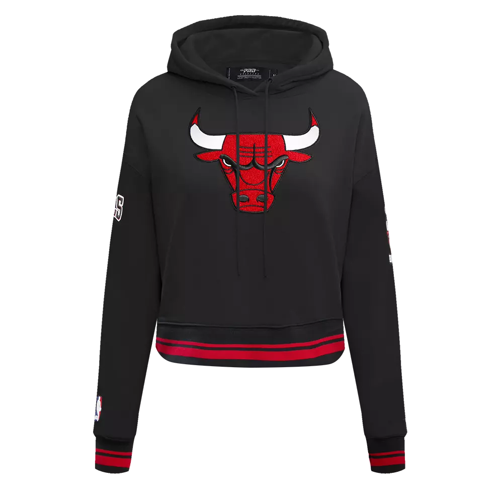 Get ready to show off your team spirit with the Pro Standard Women's Chicago Bulls Retro Classic Cropped Hoodie - Black/Red. Step up your game this season with this women's pull-over that boasts a stylish hood with adjustable drawcords and a bold team graphic print across the brim. Stand out from the crowd with chenille patch team graphics on the front and arms, solidifying your dedication to your beloved team. Not only does this hoodie showcase your loyalty, but it also offers unbeatable comfort with its ultra-soft fleece material interior and regular fit, perfect for battling the cold weather. Take your outfit to the next level by pairing it with the matching sweatpants for a complete, coordinated look that will have heads turning.Features
