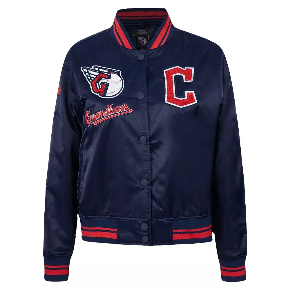 The Pro Standard Women's Cleveland Guardians Retro Classic Rib Satin Jacket - Navy/Red will make you stand out from the crowd. The midweight jacket will keep you comfortable when the temperature drops thanks to the jacket’s stand -up collar quilted lining and full-zip front. Various pockets offer storage for all essentials. This stylish jacket features faux leather sleeves and elevated team logos.Features