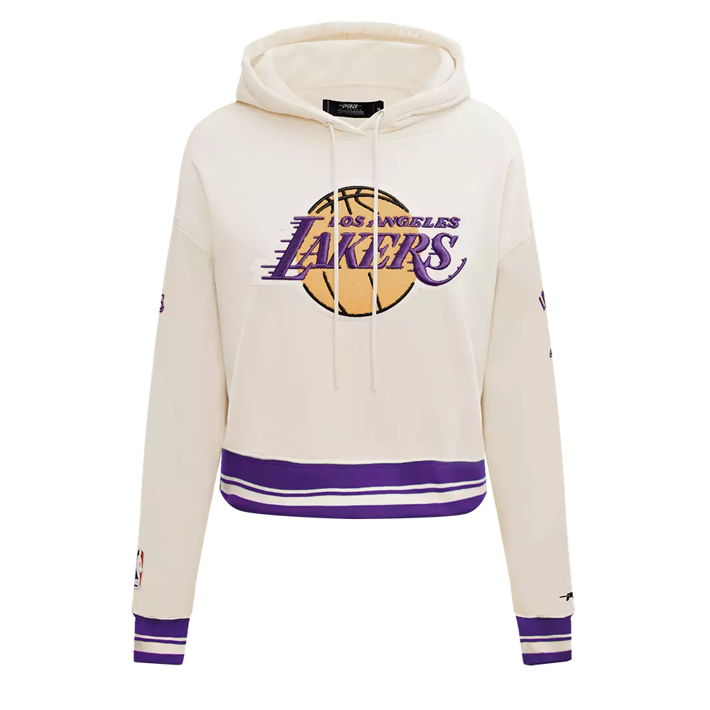 Get ready to show off your team spirit with the Pro Standard Women's Los Angeles Lakers Retro Classic Cropped Hoodie - Eggshell. Step up your game this season with this women's pull-over that boasts a stylish hood with adjustable drawcords and a bold team graphic print across the brim. Stand out from the crowd with chenille patch team graphics on the front and arms, solidifying your dedication to your beloved team. Not only does this hoodie showcase your loyalty, but it also offers unbeatable comfort with its ultra-soft fleece material interior and regular fit, perfect for battling the cold weather. Take your outfit to the next level by pairing it with the matching sweatpants for a complete, coordinated look that will have heads turning.Features