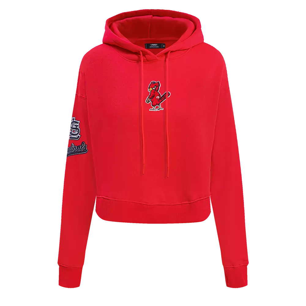 Pro Standard Women's St. Louis Cardinals Classic Fleece Cropped PO Hoodie -RedThis red Pro Standard Women's St. Louis Cardinals Classic Fleece Cropped PO Hoodie features an adjustable drawstring hood, a kangaroo pouch pocket with a soft fleece fabrication. This hoodie is perfect for staying warm and making sure your fandom is noticeable, while the cropped fit ensures all-day comfort. With striking graphics on the chest, sleeves and the back of the hoodie, you can bundle up in this comfortable cotton hoodie and rest easy in knowing your team is being well represented.