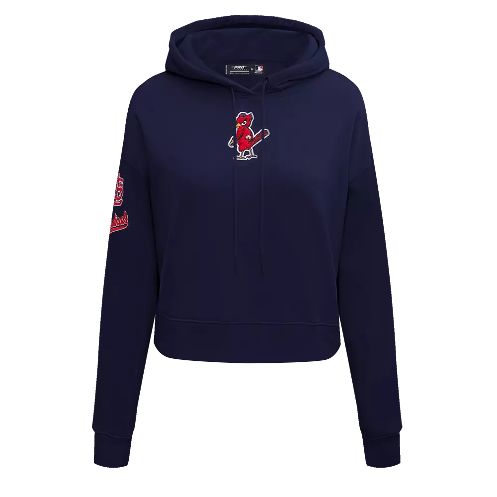 Pro Standard Women's St. Louis Cardinals Classic Fleece Cropped PO Hoodie -NavyThis navy Pro Standard Women's St. Louis Cardinals Classic Fleece Cropped PO Hoodie features an adjustable drawstring hood, a kangaroo pouch pocket with a soft fleece fabrication. This hoodie is perfect for staying warm and making sure your fandom is noticeable, while the cropped fit ensures all-day comfort. With striking graphics on the chest, sleeves and the back of the hoodie, you can bundle up in this comfortable cotton hoodie and rest easy in knowing your team is being well represented.