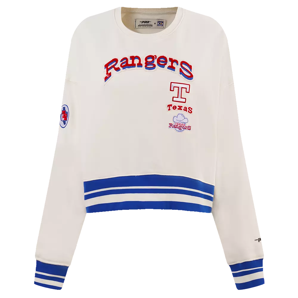 Introducing your new staple crewneck. This Pro Standard Women's Texas Rangers Retro Classics Crewneck - Eggshell features embroidered team graphics paired with contrast trims for a striking look, finished off with ribbed trims constructed on premium cotton for maximum comfort.Features