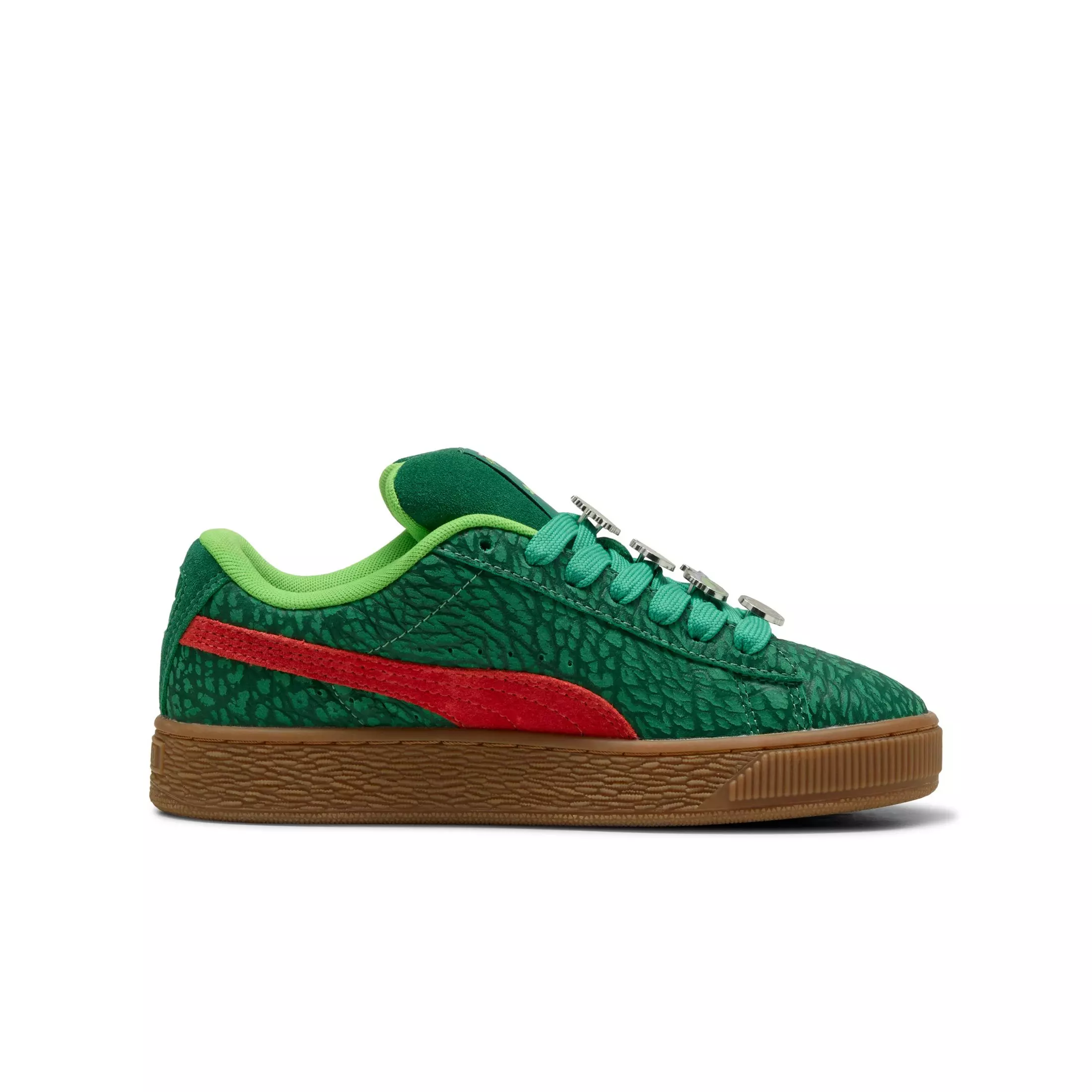 The PUMA Suede XL "TMNT" Grade School Boys' Shoe celebrates the Teenage Mutant Ninja Turtles crime-fighting quartet with a green suede upper, exaggerated padded collar and tongue, and a chunkier sole that channels skater aesthetic. It draws on PUMA’s breakdancing heritage and modern streetwear influence.