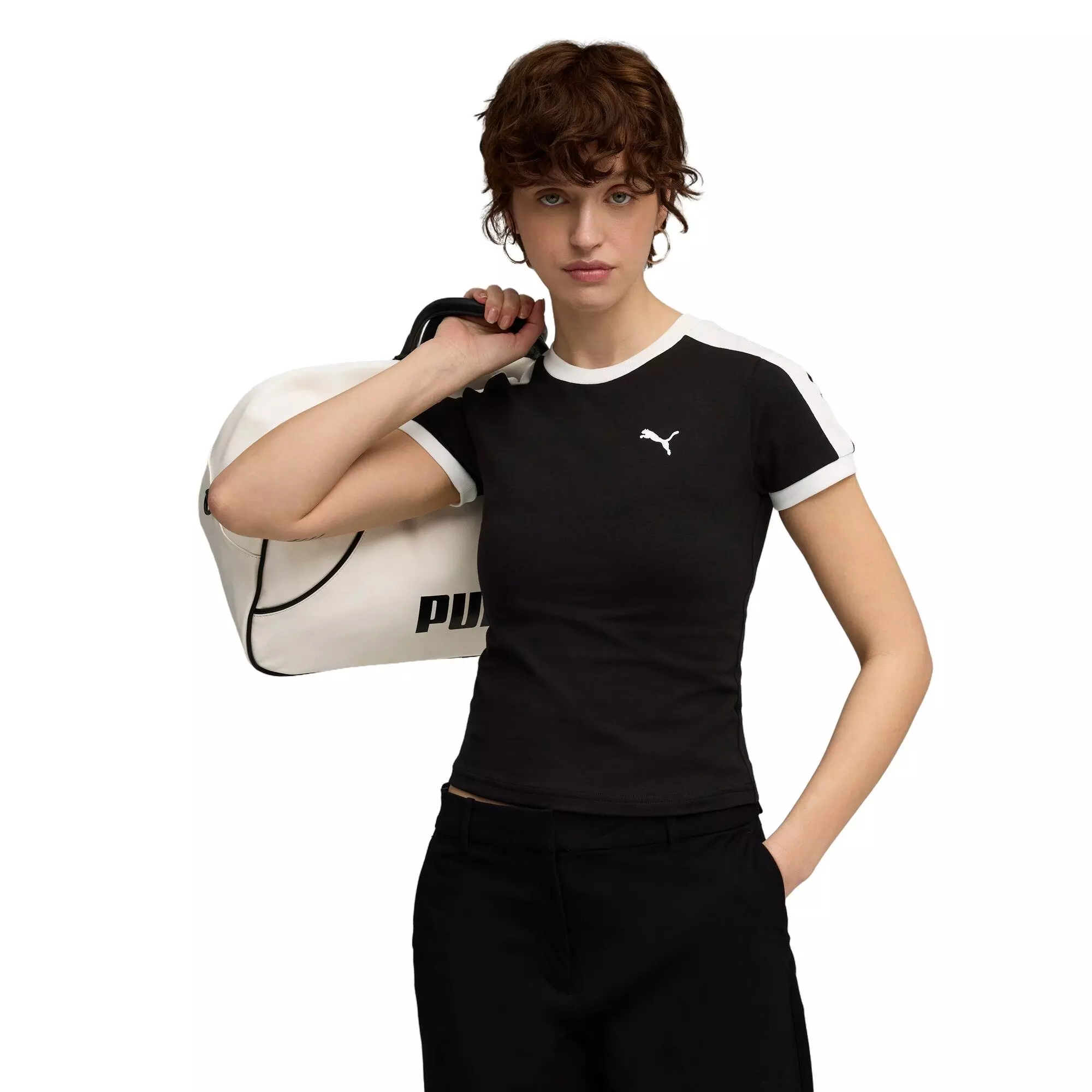 The PUMA Women’s T7 Slim Tee - Black brings a sleek, body-skimming fit with the brand’s iconic T7 stripes down the sleeves for a sport-inspired look you can dress up or down. Soft, breathable cotton keeps you comfortable from morning errands to late-night hangs.