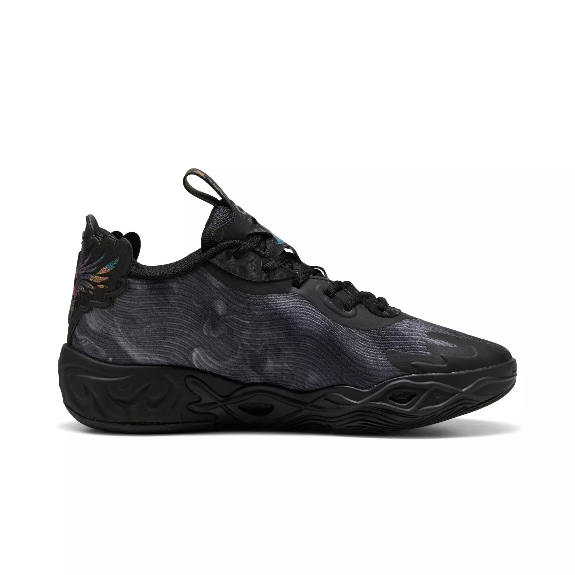 PUMA x LAMELO BALL MB.04 "Black/Dark Amethyst" Men's Basketball Shoe from PUMA x LaMelo Ball draws on LaMelo Ball’s out-of-this-world style. Its alien-textured upper and signature wings logo wrap the heel, while double-layered mesh boosts breathability and support.