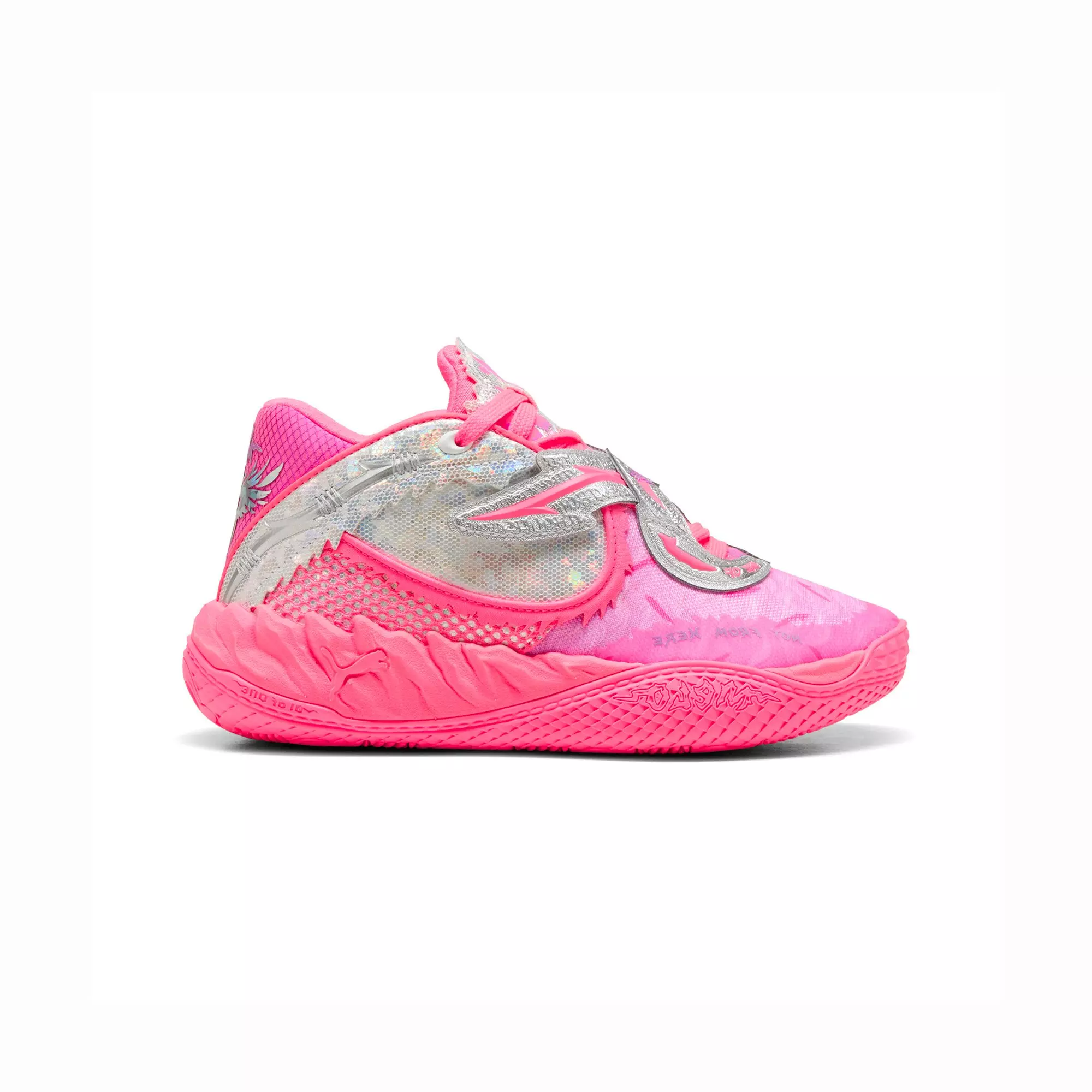 The PUMA x Lamelo Ball MB.05 "World Tour" Grade School Kids' Basketball Shoe by PUMA x LaMelo Ball features a breathable double-layer mesh upper in neon green. Pink embroidered stripes on the lateral side enhance lateral stability and add visual contrast, while the mesh design maintains airflow. The neon green hue delivers a bold on-court look.