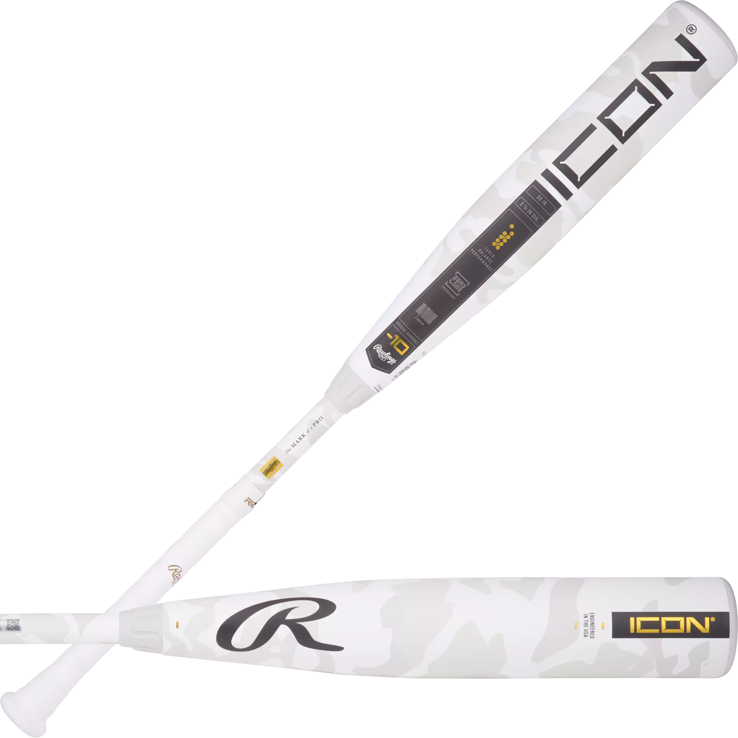 Zero-Loss technology strengthens the joint and eliminates hand-rattle feedback. Tuned Balanced performance ensures ideal swing weight, barrel control and bat speed. RevGrip material adds superior tack and cushion. A white camo pattern with black and gold accents completes the look.
