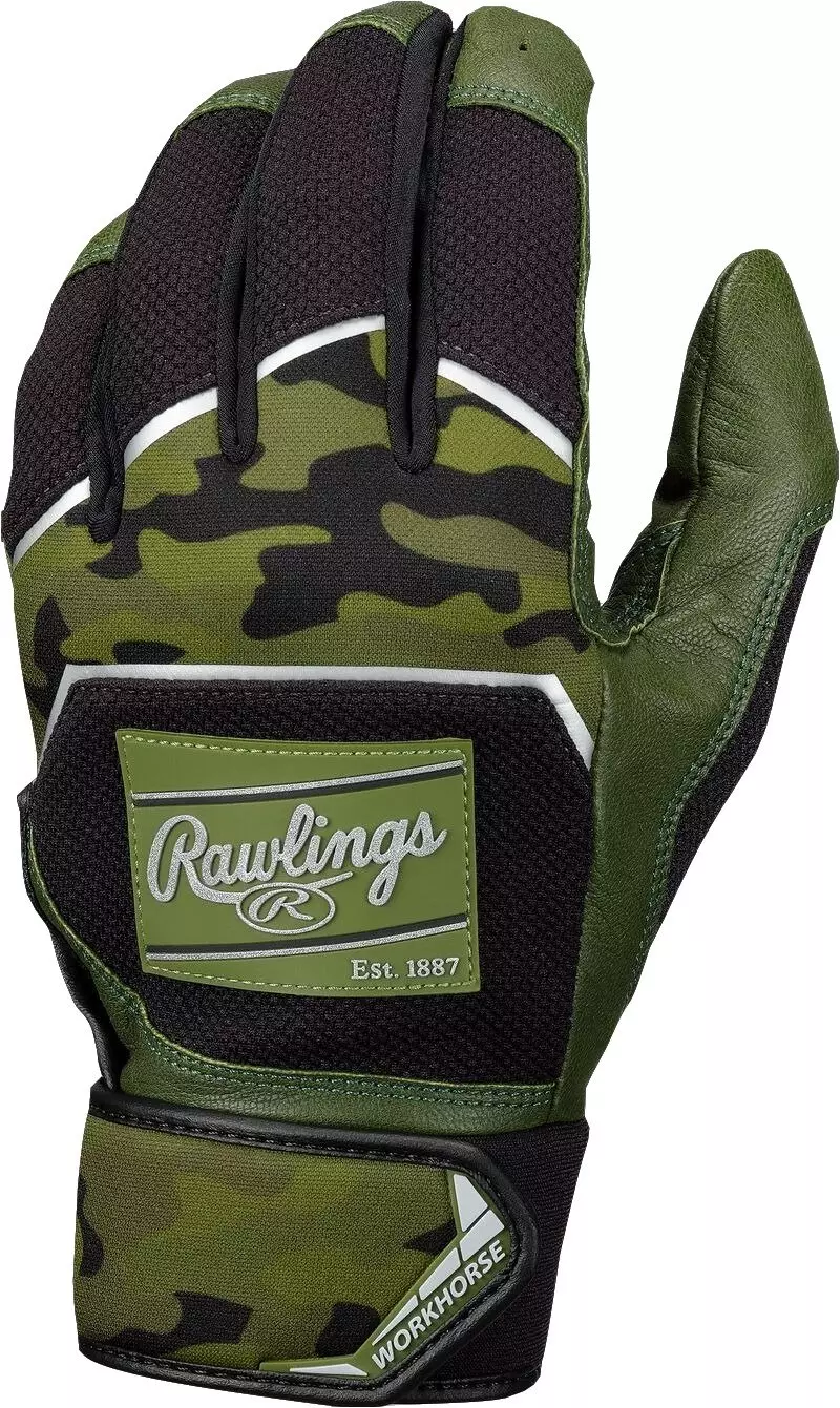 Rawlings Workhorse Adult Baseball Batting Gloves - CamoGo up to bat with more confidence wearing the Rawlings Workhorse Adult Baseball Batting Gloves - Camo. We've taken the old trusted Workhorse design and made it even better! These top-of-the-line batting gloves were meticulously constructed with a durable Oiltac leather palm. This gives you incredible durability and performance, so you can have superior bat control with every swing.