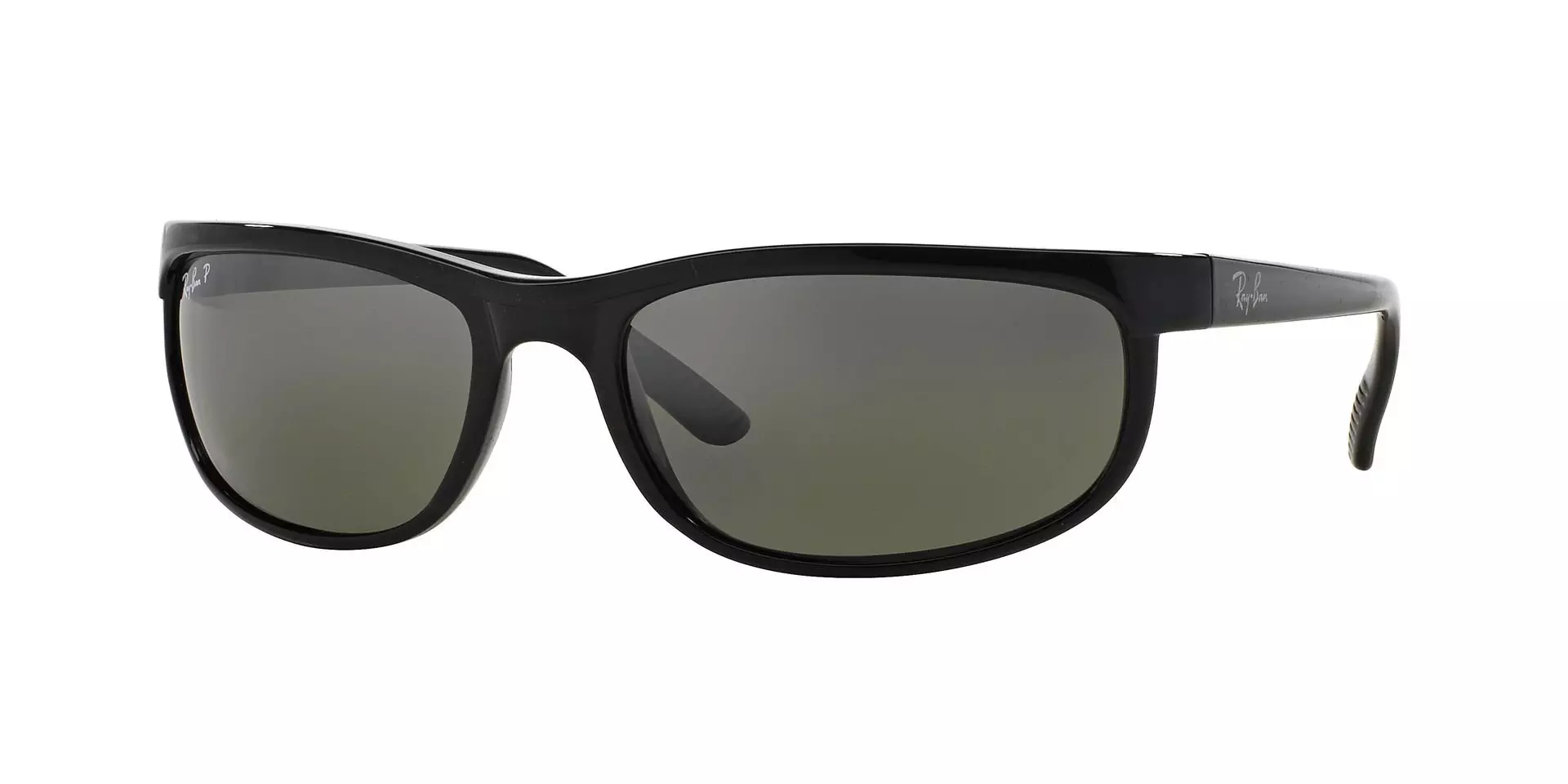 Ray-Ban RB2027 Predator 2 sunglasses take on the traditional Rectangle Sunglasses design with a Ray-Ban signature logo that is displayed on the thin temples. The inside of the Predator temple tips feature a subtle, striped texture treatment. Their wrapped fit creates a sporty look that is both casual and athletic.