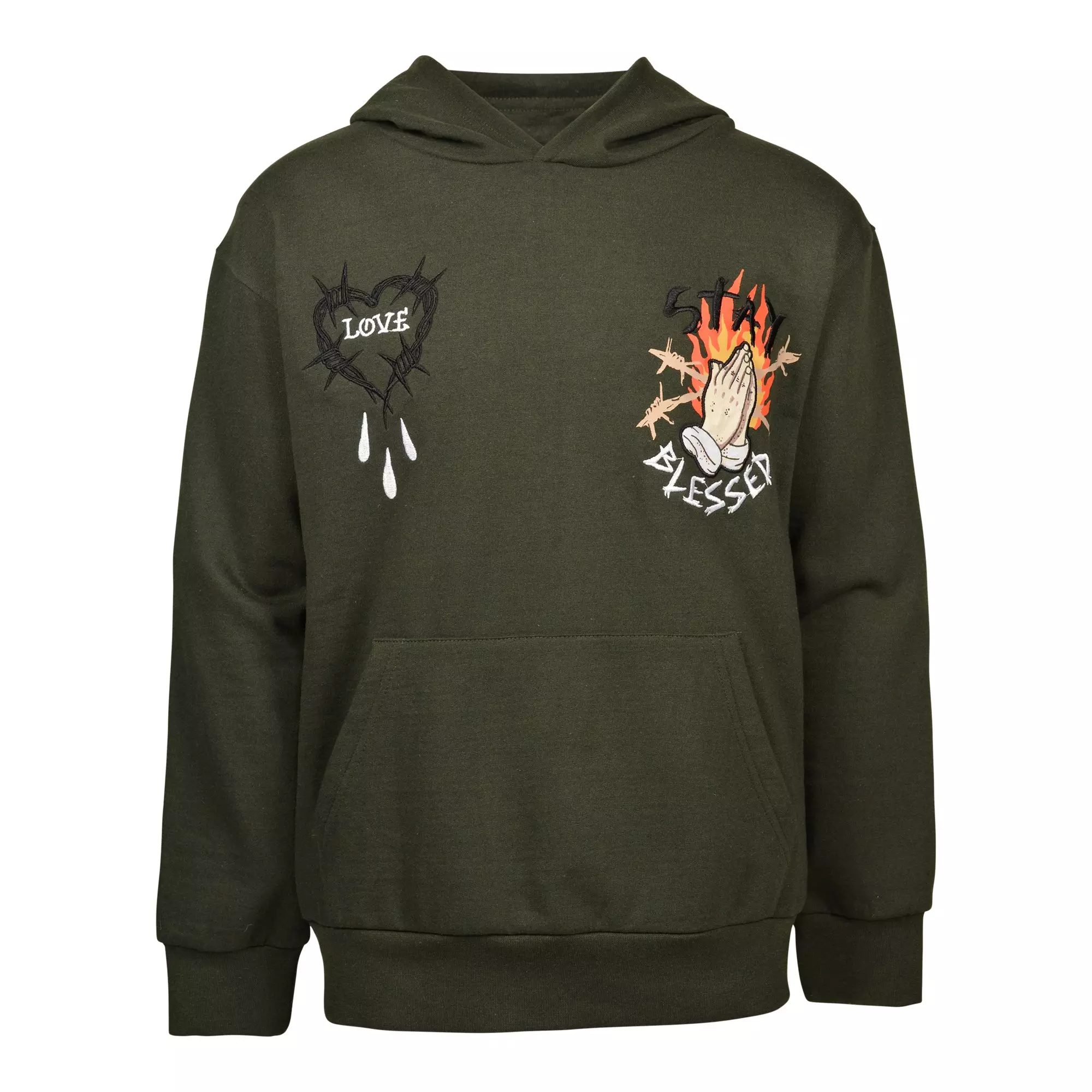 Layer up in the Reason Big Boys' Hoodie - Olive, a cozy pullover with a modern streetwear edge. Soft fleece fabric and a roomy hood deliver everyday warmth, while colorful embroidery and bold embellishments add standout style for school, weekend hangs, and everything in between.