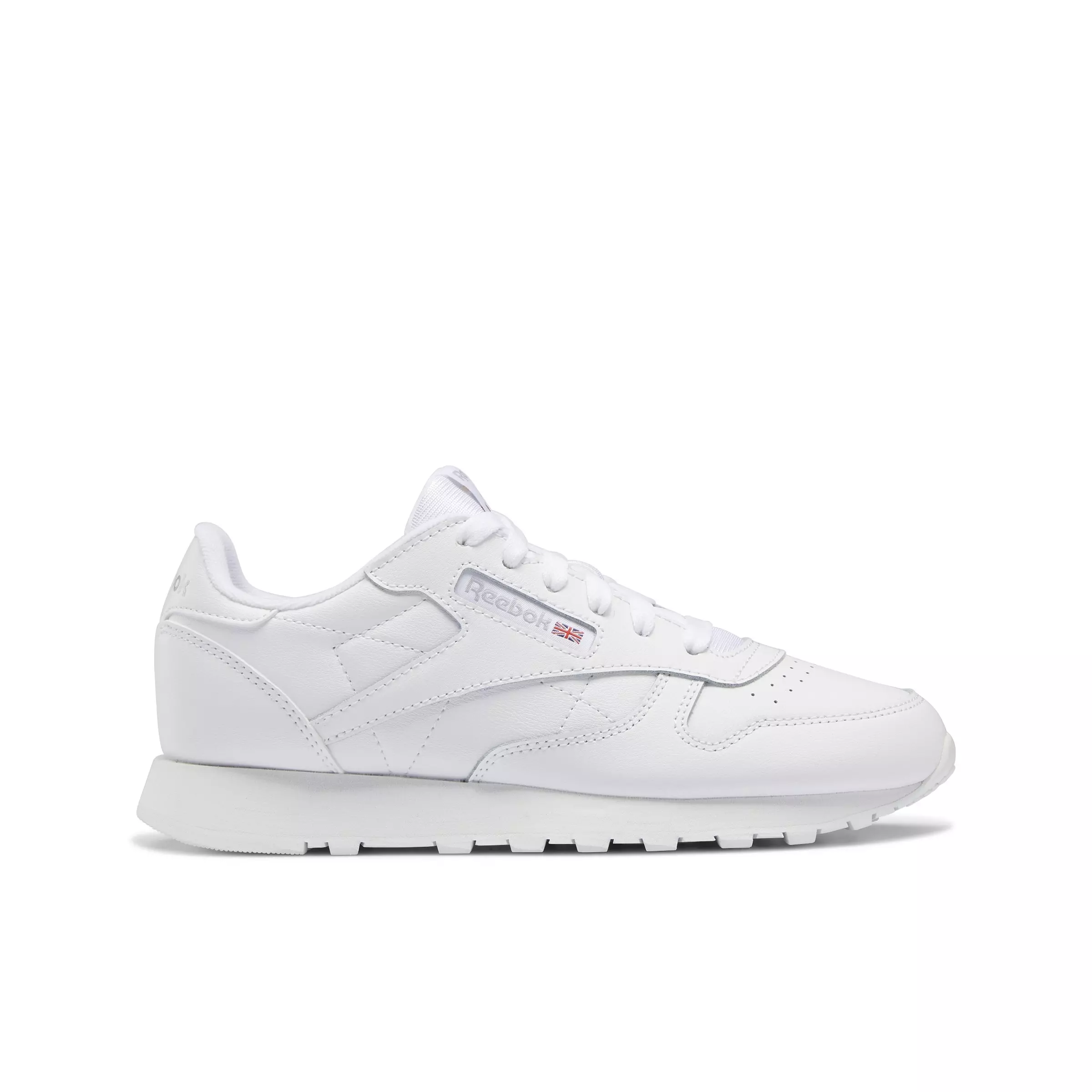 Pared-back and timeless, the Reebok Classic Leather "Ftwr White/Ftwr White/Ftwr White" Grade School Boys' Shoe keeps his look clean with an all-white heritage profile. A smooth leather upper feels soft from day one, while a cushioned midsole supports everyday moves from class to weekend.
