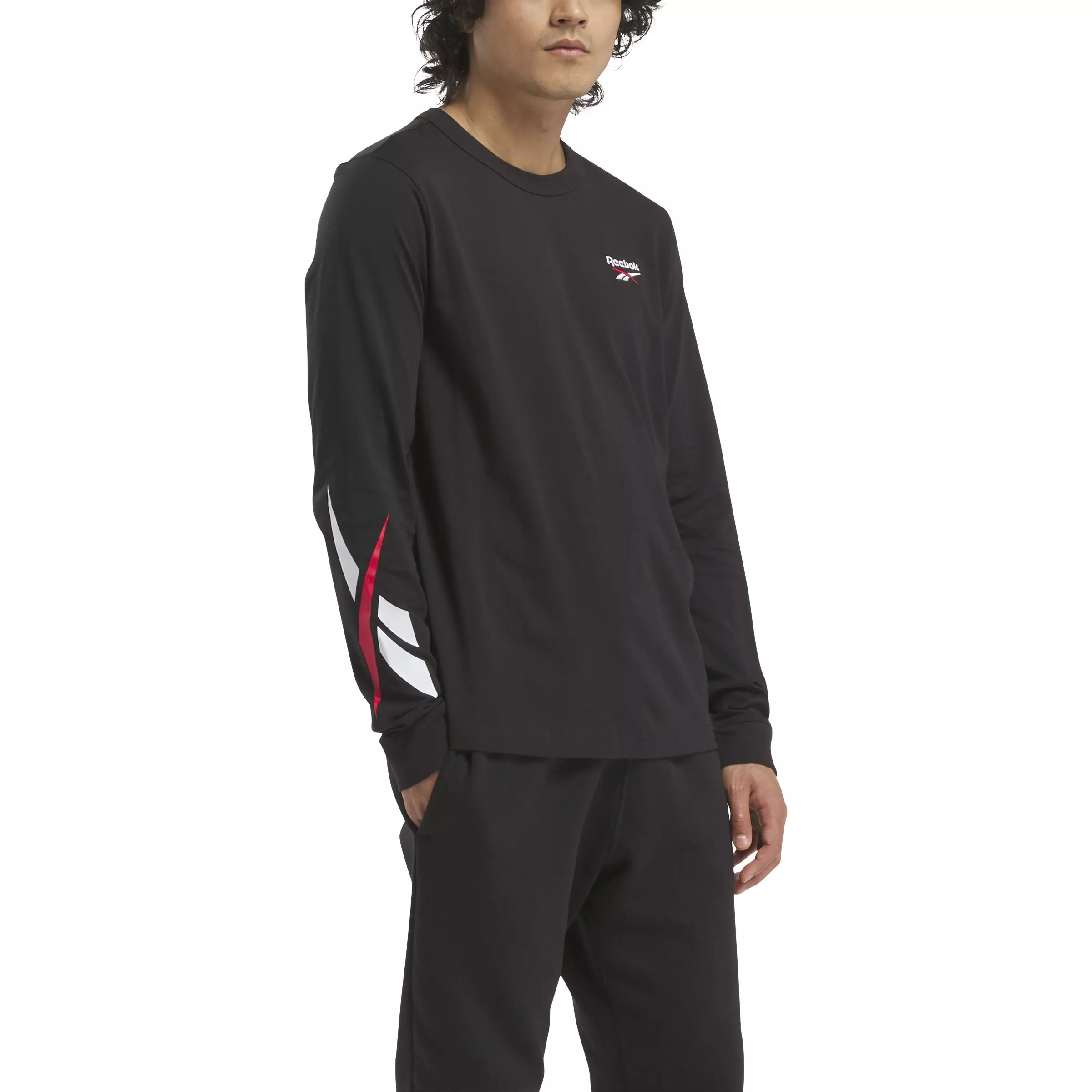 Head out in a soft Reebok Men's Identity Crosscheck Long Sleeve Shirt that gives you the retro Reebok goods. Represent old-school style with a graphic that's a deep cut from the archives. Two-tone details and embroidery elevate this essential tee.Features