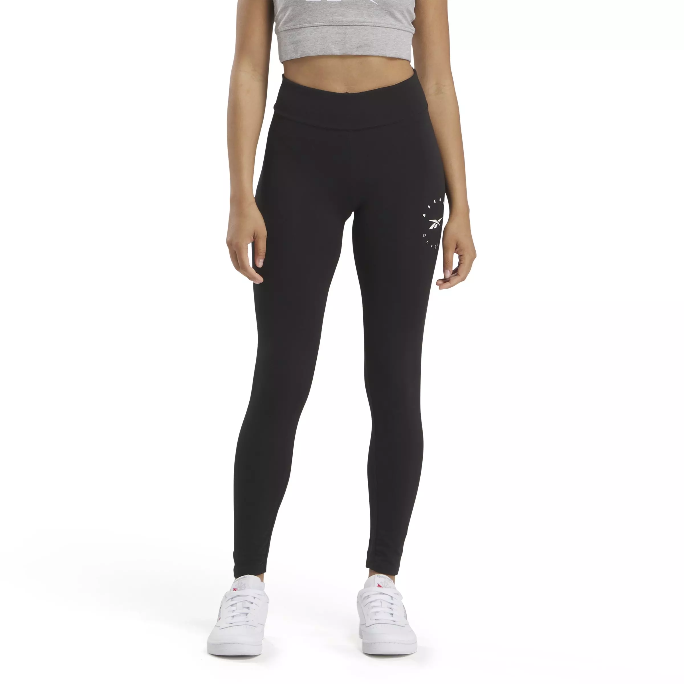 A clean black finish pairs with anything, while a seasonal Reebok graphic on the left leg adds subtle sport energy. Wear them for studio sessions, casual layers, or laid-back weekends—comfortable support and effortless style, all day.