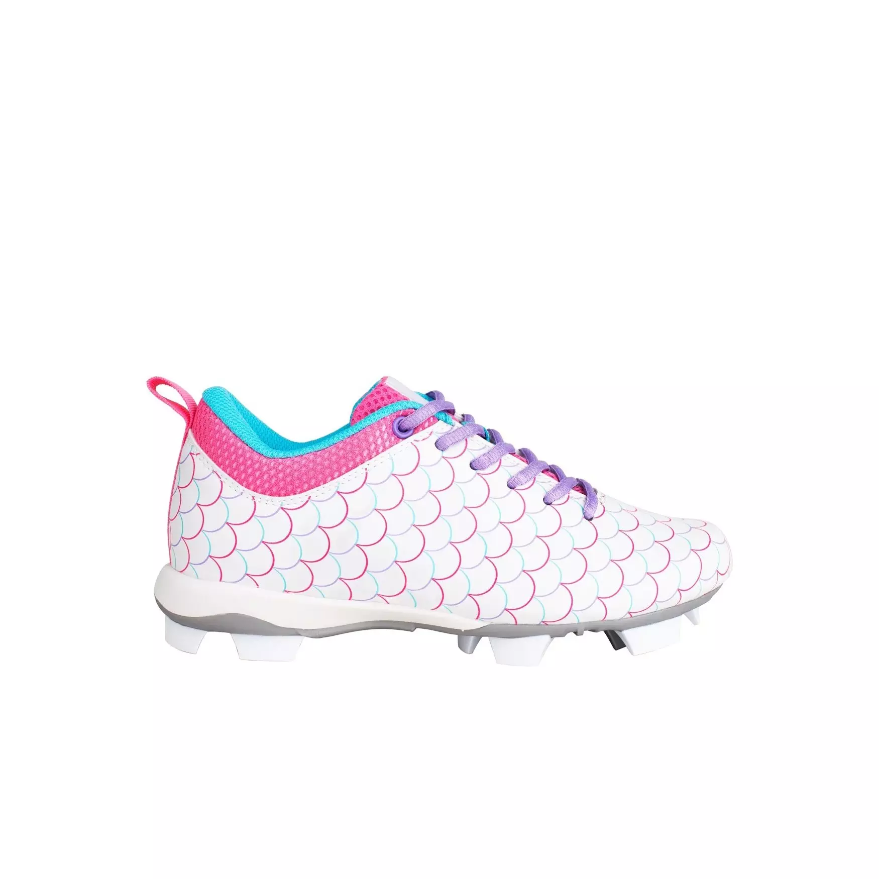 The RIP-IT Emma Play-Ball "White/Pink/Purple" Preschool Girls' Softball Cleat is a unique cleat with a colorful mermaid scale pattern that matches personality and showcases individuality. Vibrant white, pink and purple accents brighten every play.