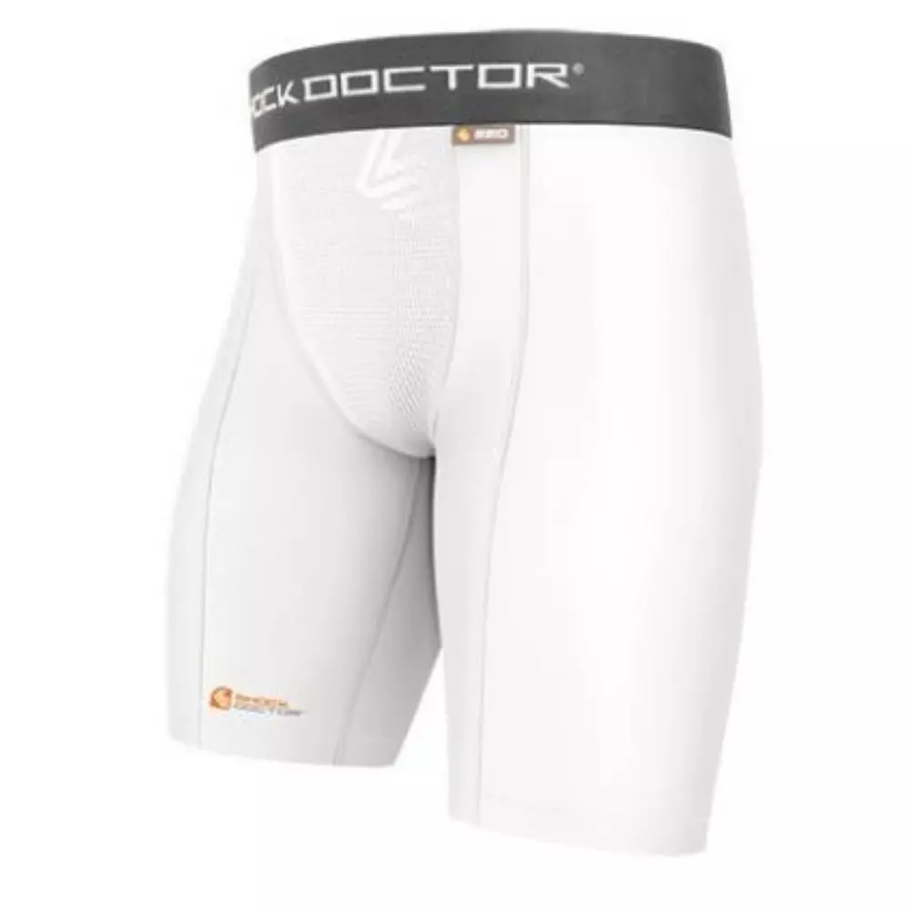 These Shock Doctor Compression shorts have been a favorite among our customers for many years. Made of a moisture-wicking anti-microbial fabric, these shorts offer great compression and support. They also integrate a ventilated cup pocket, which accommodates most standard cup styles. The X-FIT Cup Retention System offers a wraparound external supporter for unparalleled comfort, fit and protection.Features