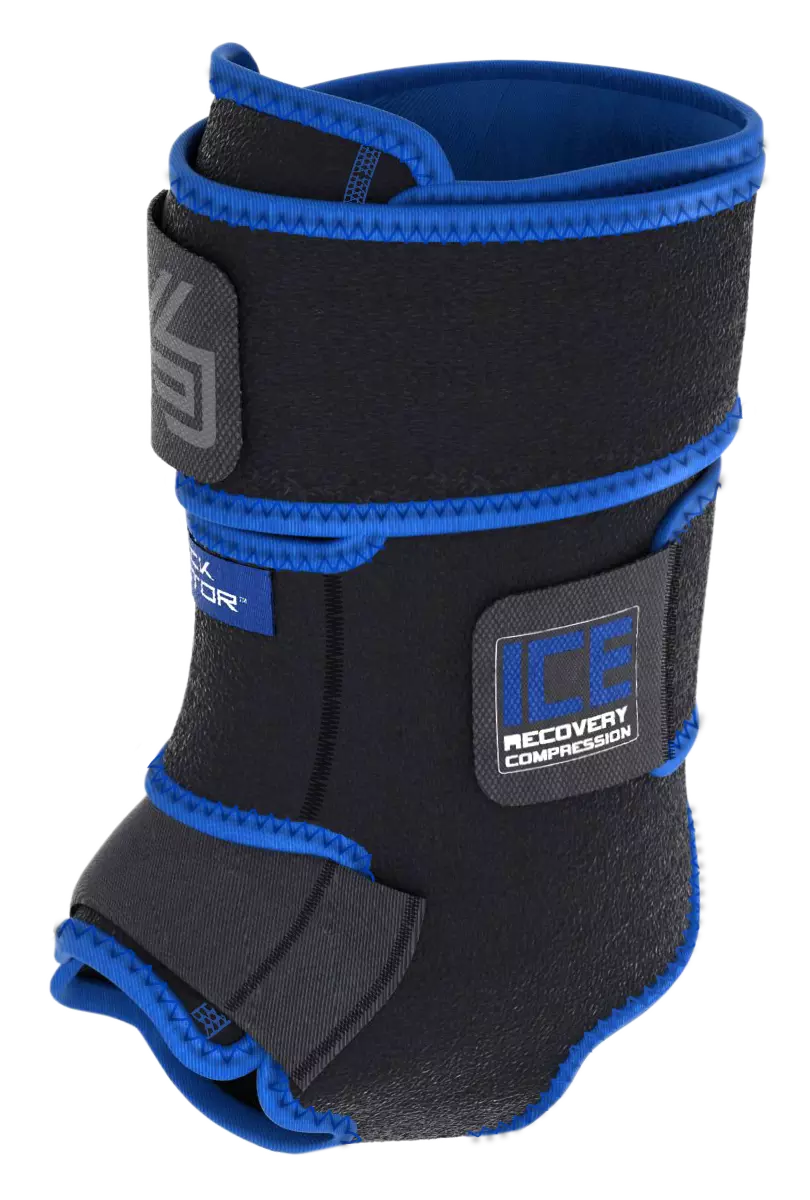 Accelerate recovery with the Shock Doctor® ICE Recovery Ankle Compression Wrap. Designed to provide penetrating 360° ice coverage to injured or sore ankles, the Gel Packs extract heat from the ankle joint, foot and lower leg to help reduce swelling and pain. The wrap has adjustable straps with Z-Grip™ closures for custom fit and continuous compression. N-Tex™ provides gentle compression with maximum comfort and durability.Features