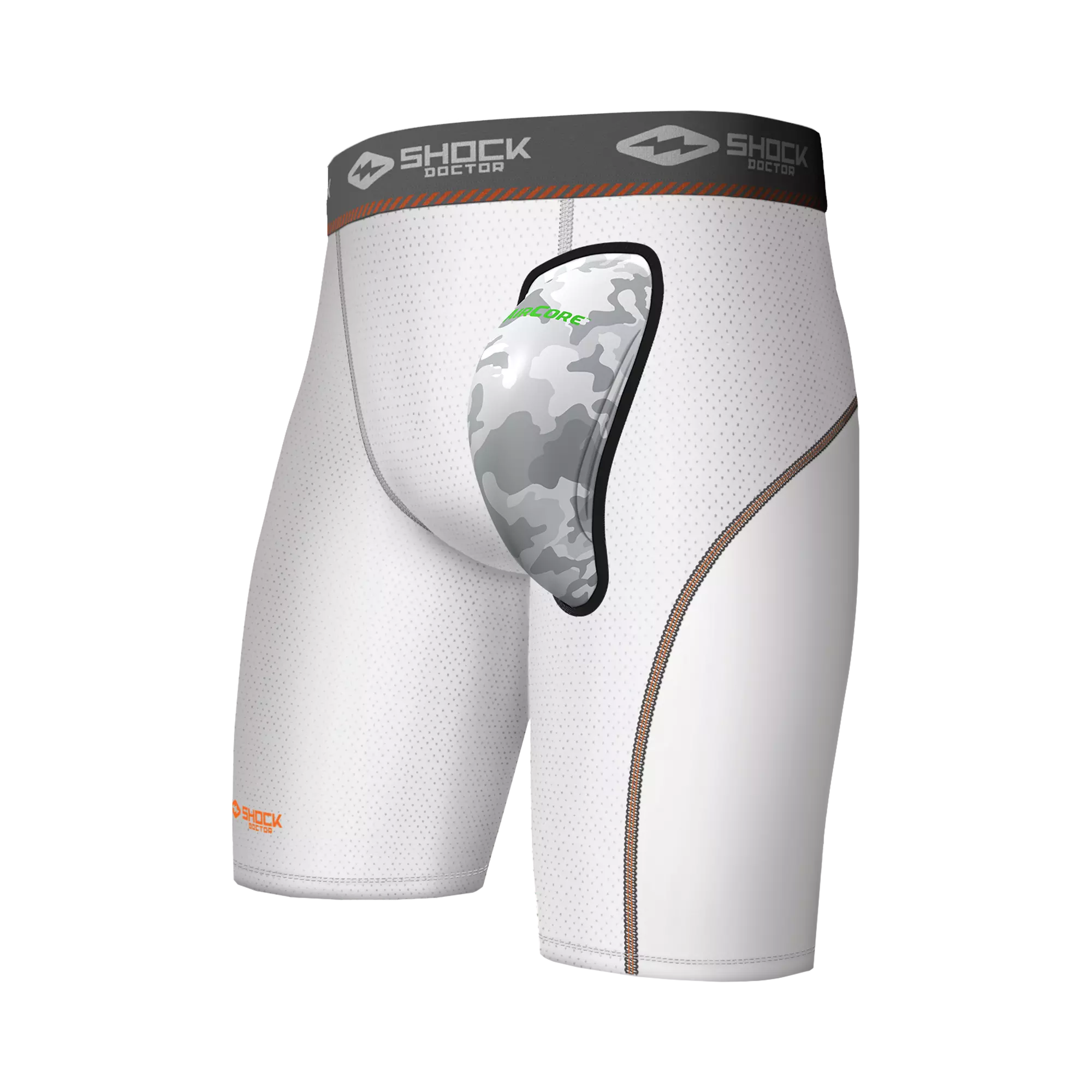 The Ultra Cup Retention system secures the cup pocket in a natural position, keeping the cup in place. It includes the Shock Doctor Aircore Cup with patented 3-layer fusion technology and weighs 30% less than traditional molded cups.