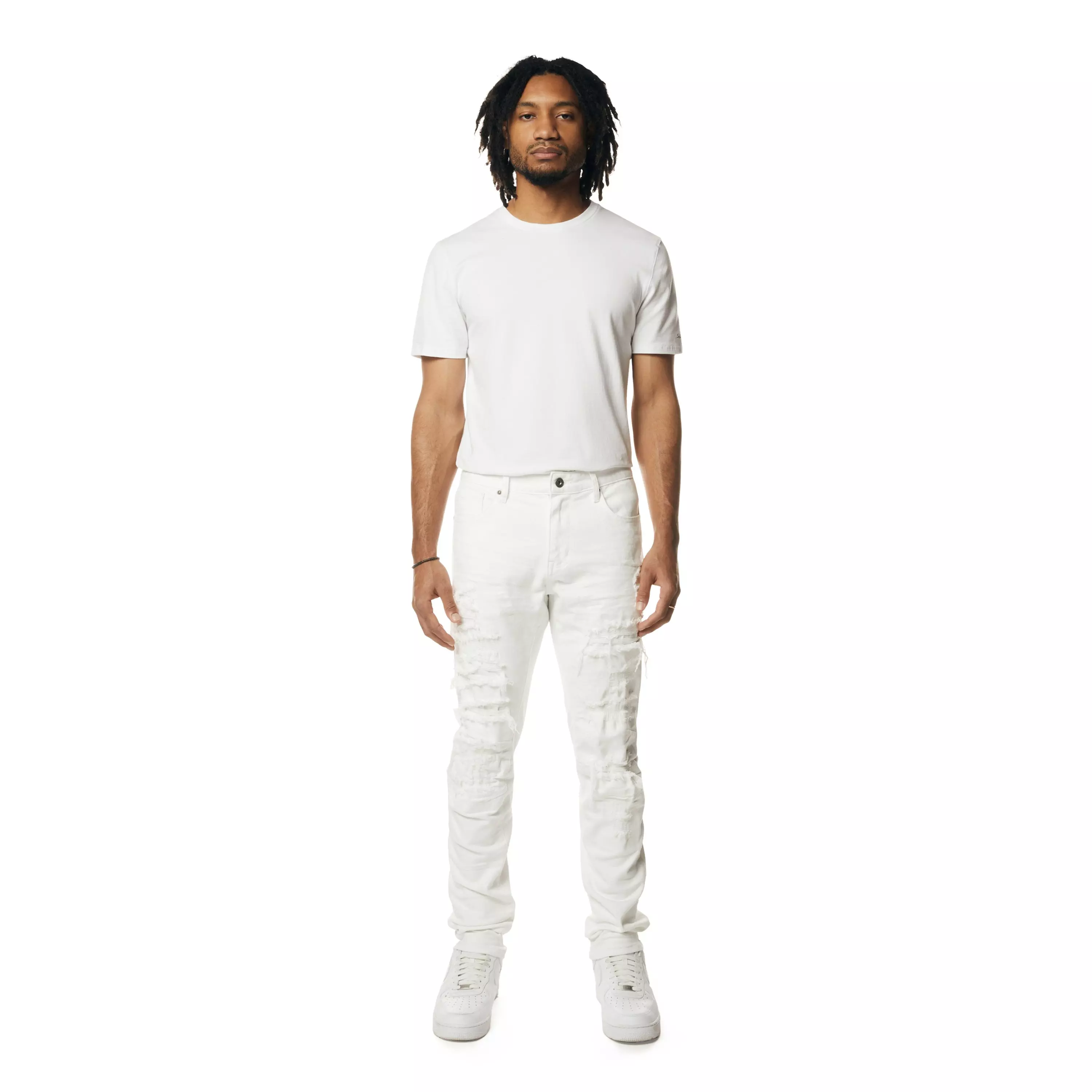 Smoke Rise Men's Essentials Rip & Repair Slim Fit Denim Jeans - White delivers a slim silhouette with style and comfort. High-quality stitching shapes a crisp, modern, laid-back look and maintains structure while allowing all-day movement.