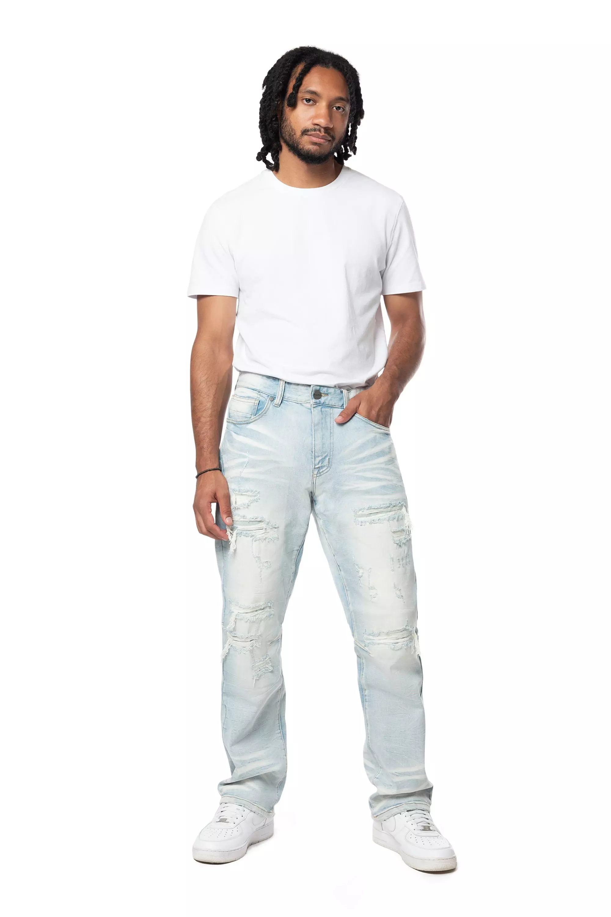 The Smoke Rise Men's Rip & Repair Lightning Straight Fit Denim Jeans - Cirrus Blue deliver dependable, consistent comfort through specially constructed rip and repair detailing. A smooth, straight fit enables ample motion and independent movement free from restrictions.