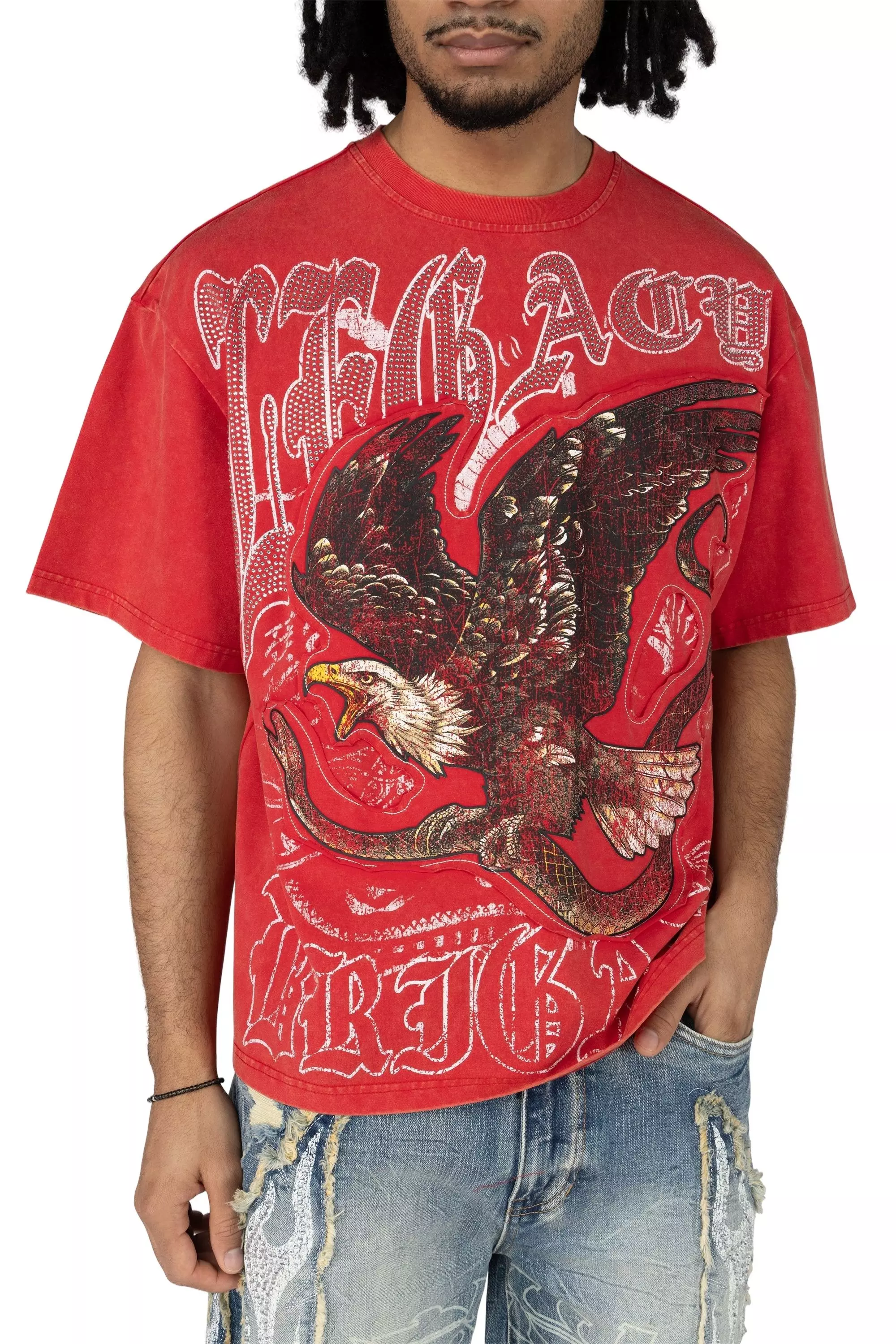 The Smoke Rise Men's Wide Crop Eagle Tee - Red features a bold eagle graphic across the front. Its wide crop silhouette adds modern edge to casual looks.