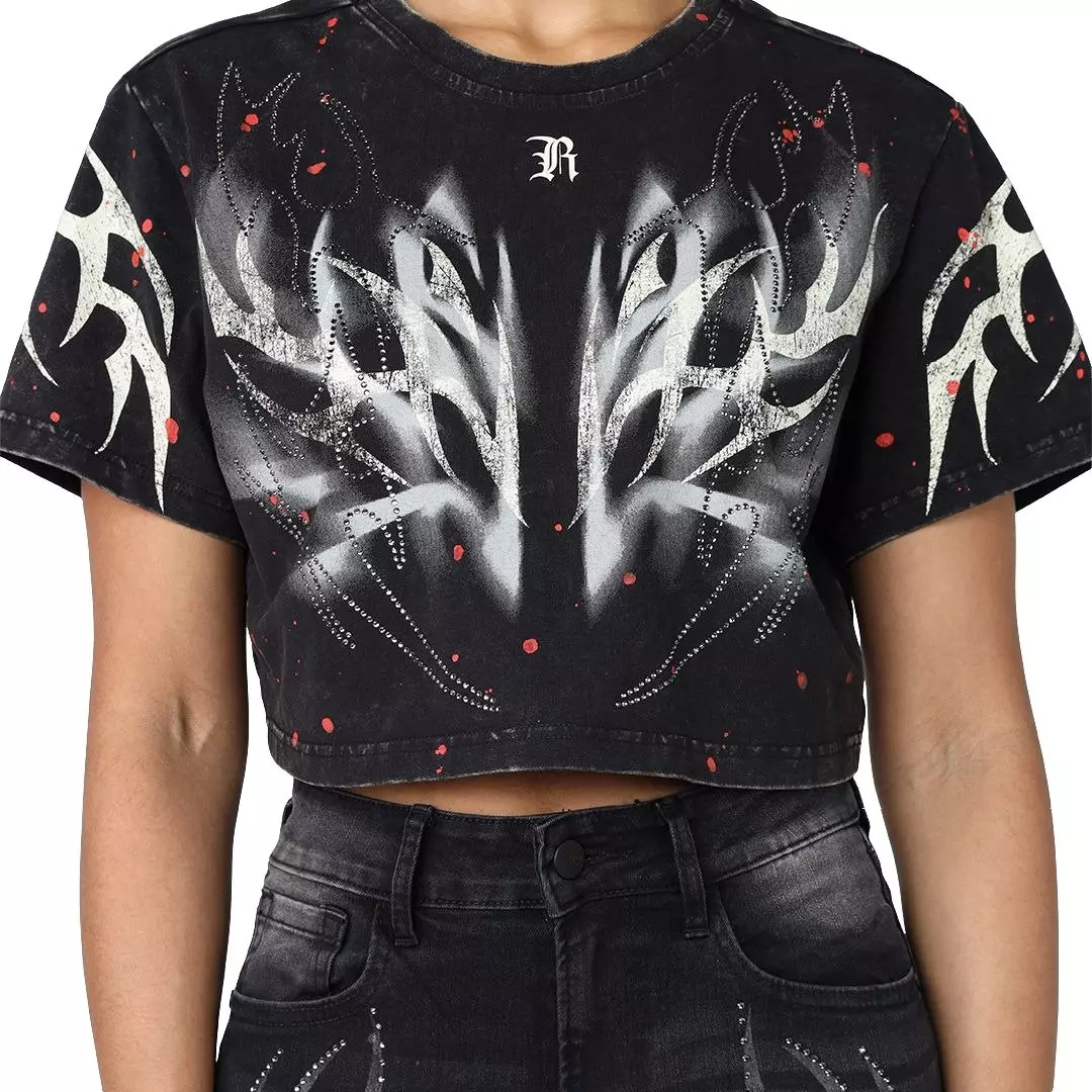 Subtle wing accents add a cool edge without stealing focus. This crop tee blends relaxed comfort and statement style in one versatile piece. Wipe away spills or toss it in the wash without worry.