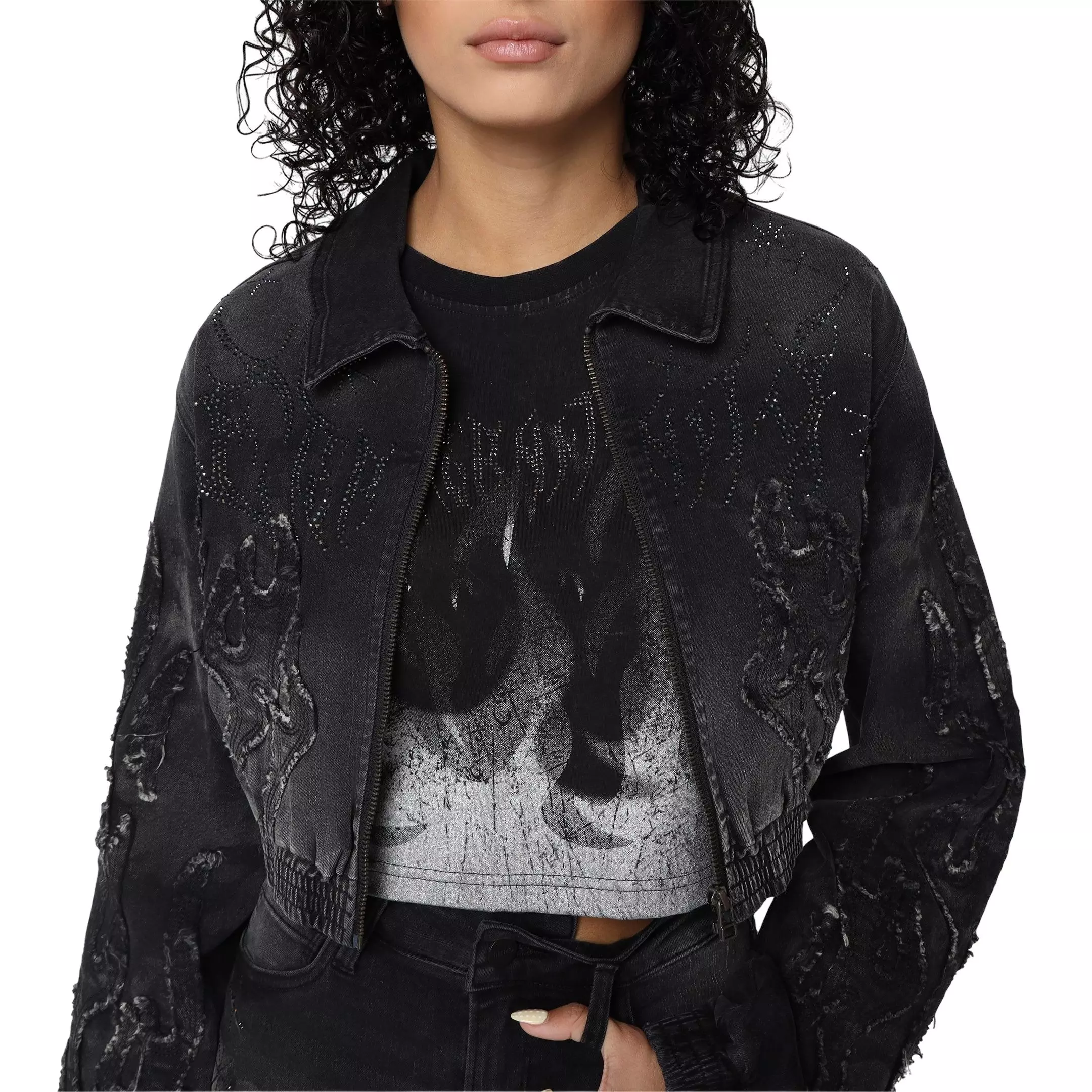 Meet the Smoke Rise Women’s Flame Denim Bomber - Black, a statement layer that blends rugged denim with bold flame detailing in a modern, cropped silhouette. A full-zip front and ribbed trim offer a secure, comfy fit, while durable construction stands up to daily wear.