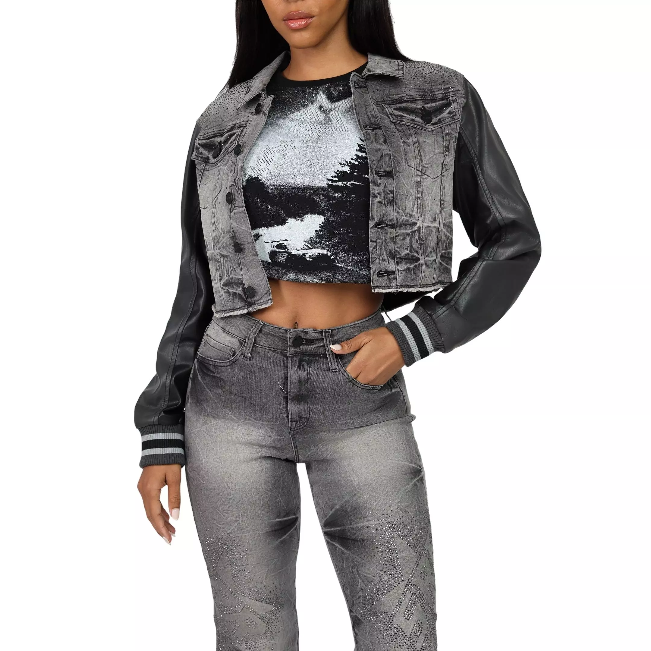 The Smoke Rise Women's Rhinestone Denim Trucker Jacket blends sturdy fabrics and classic varsity details into a packable layering piece. It showcases a vibrant vintage look with a cozy feel.It features a cropped fit and easy button closures. The jacket holds warmth without bulk, adapts to seasonal shifts and stows compactly when storing. Wear it during sports, casual outings and outdoor adventures.