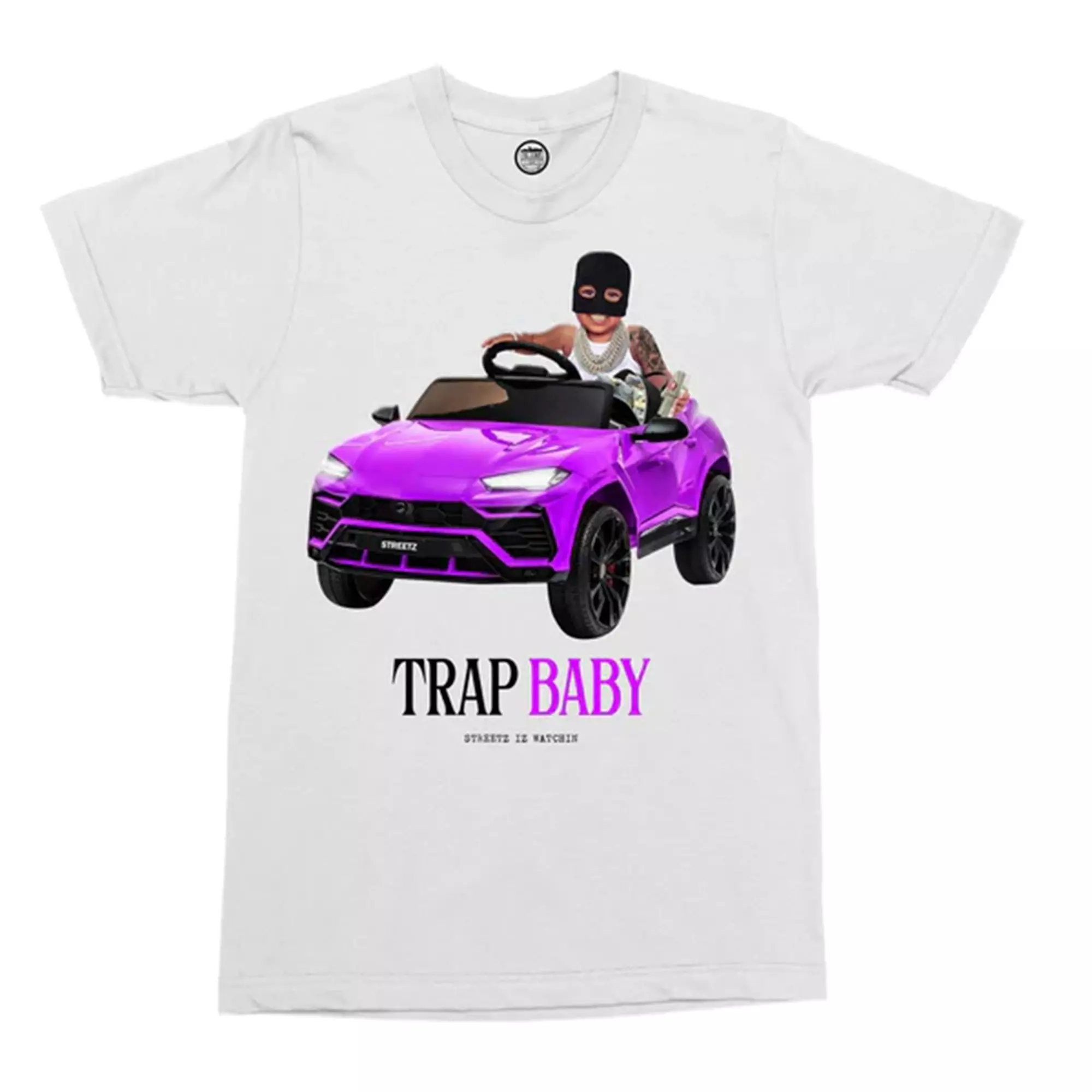 The Streetz Iz Watchin Men's Trap Baby 3 Tee is a must-have for those who want to make a statement with their streetwear. This features a bold design on the front and back that showcases your urban style. Made with comfortable fabric, this tee offers a cozy and relaxed fit.Features