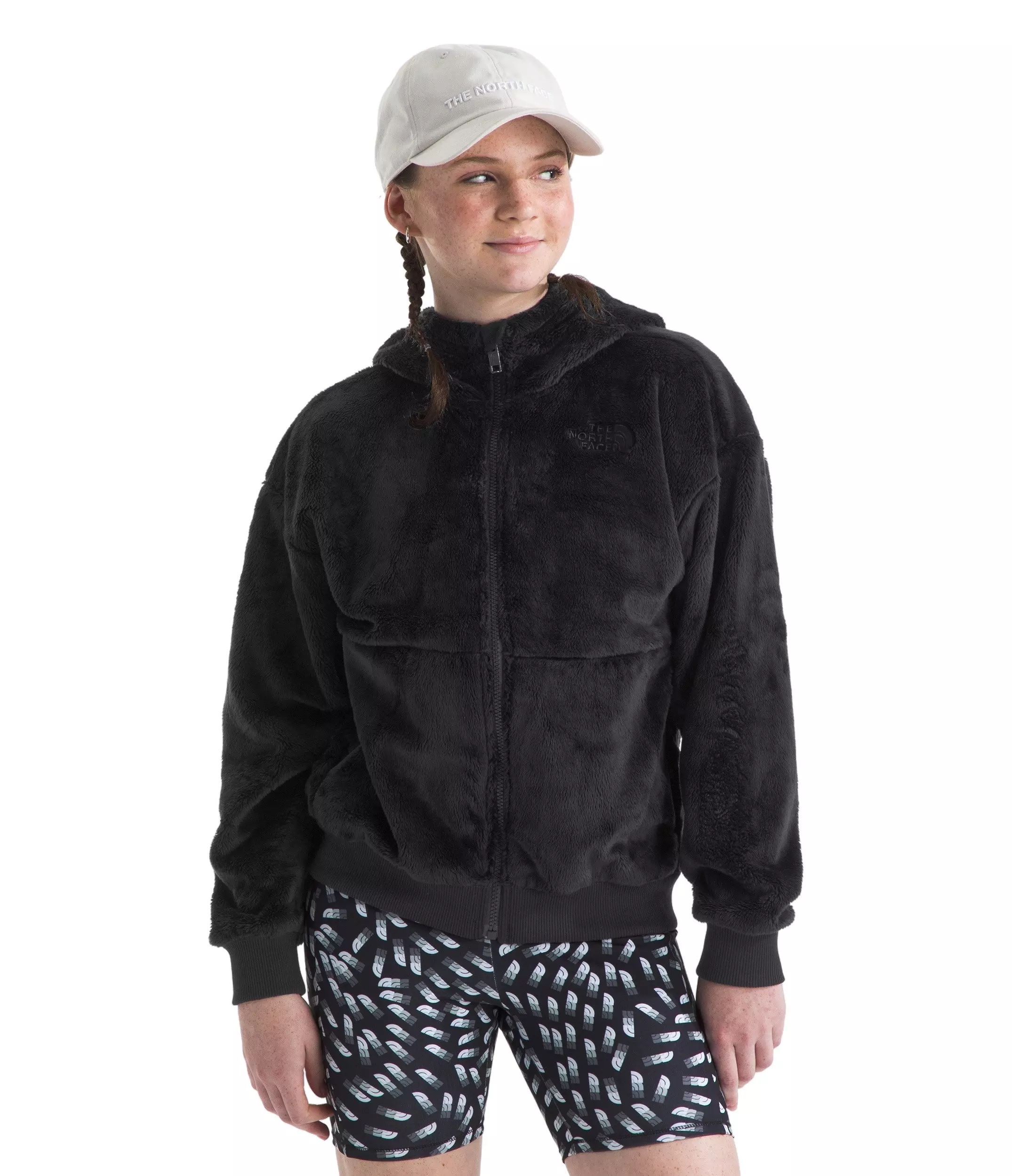 The impossibly soft The North Face Big Girls' Osito Full-Zip Hooded Jacket - Black, made with a 100% recycled fabric, provides instant, heavyweight warmth. A relaxed fit allows room for layering, so they can easily throw it on for recess or to help you gather wood for the campfire. We’ve updated our youth sizing. Please use our sizing guide to find your best fit.Features