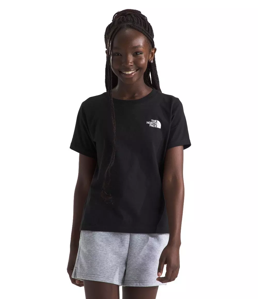 The North Face Big Girls' Short Sleeve Graphic Tee -Black/MultiThis black & multi The North Face Big Girls' Short Sleeve Graphic Tee is a great inner or outer layer, depending on conditions. At least 50% of the fabric is constructed from Climate Conscious Cotton grown in the U.S.