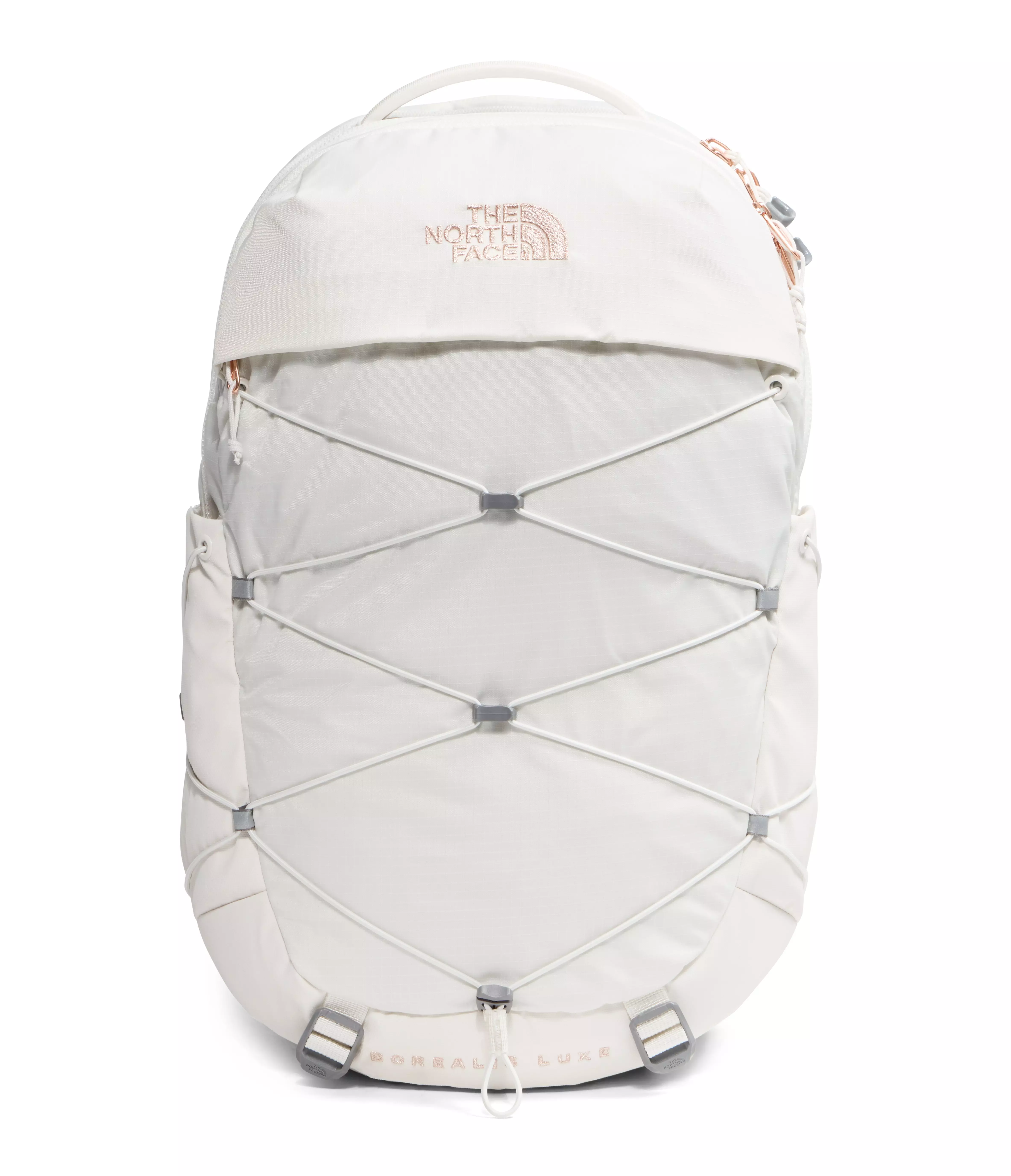 The North Face Borealis Luxe Backpack-white/lt coral is now available in a Luxe version, that has premium metallic accents. With its iconic bungee cord system, FlexVent™ suspension system and large interior compartment, you can keep your items secure, inside and out. This go-anywhere pack also features a stand-up design, sternum strap, removable waist belt and protective laptop compartment.Features