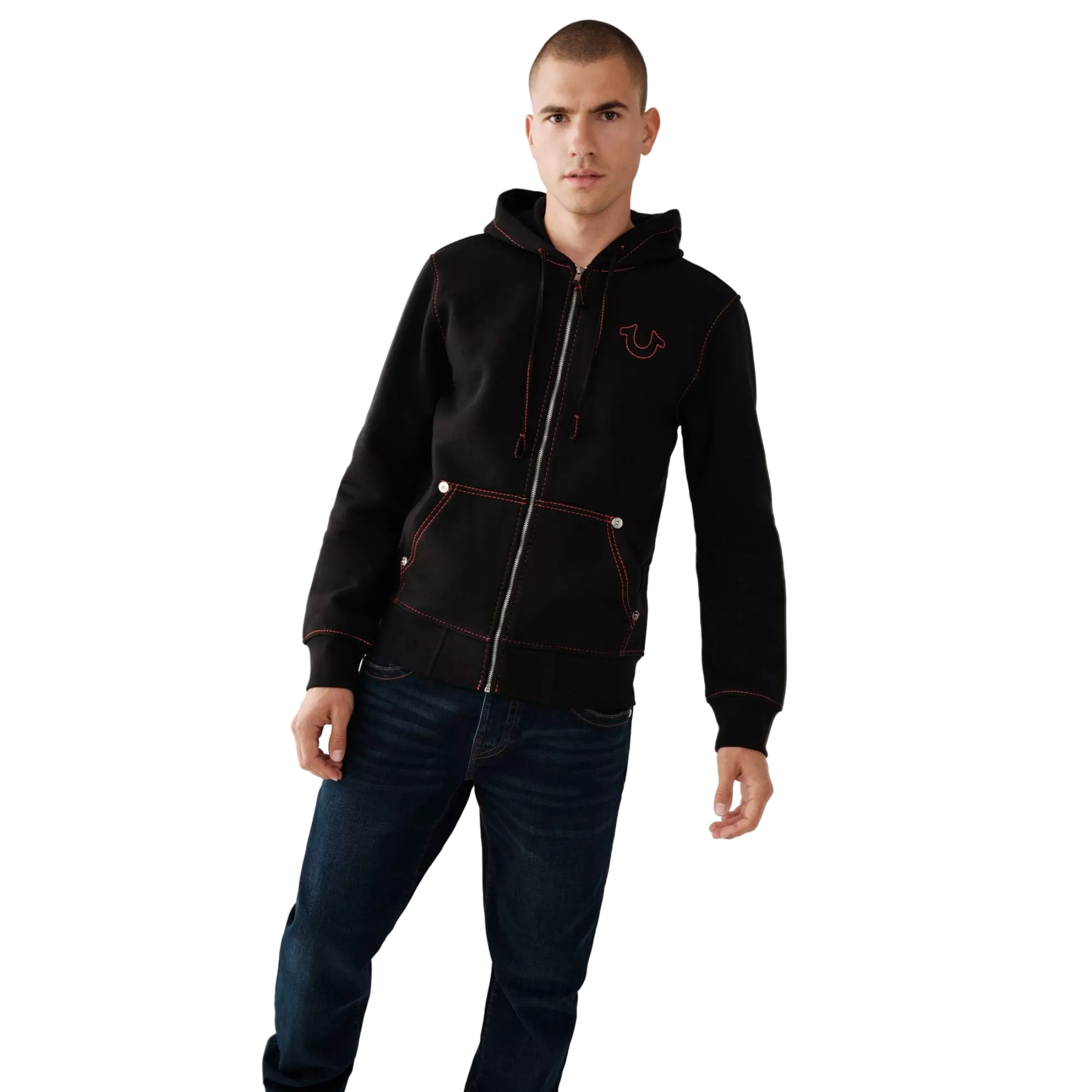 The True Religion Men's Big T Zip Up Jacket is a true must-have. Designed from a cozy cotton blend, this men's sweatshirt features a hooded zip front design, rivet detailed split kangaroo pockets, and contrast Big T stitching throughout. Finished with an embroidered stitch horseshoe at the chest and branded Buddha design across the back.Features