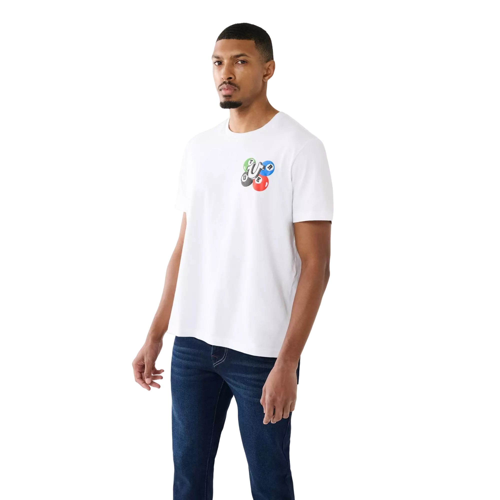 Elevate your off-duty rotation with the True Religion Men's Billiard Buddha Logo Tee, a soft short-sleeve crewneck featuring a bold Billiard puff-print graphic up front. The classic silhouette pairs easily with denim or joggers for everyday wear.