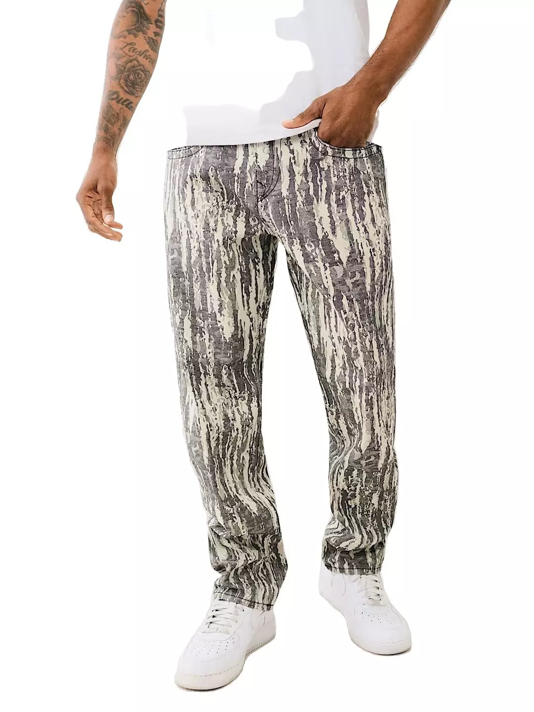Step out and stand out in the True Religion Men's Jacquard Bobby Big T Loose Fit Denim Jeans. These men’s jean are crafted with a unique jacquard print and feature a zip fly, belt loops, and a five-pocket construction. Finished with horseshoe detailing on the back pockets and 32” inseam.Features