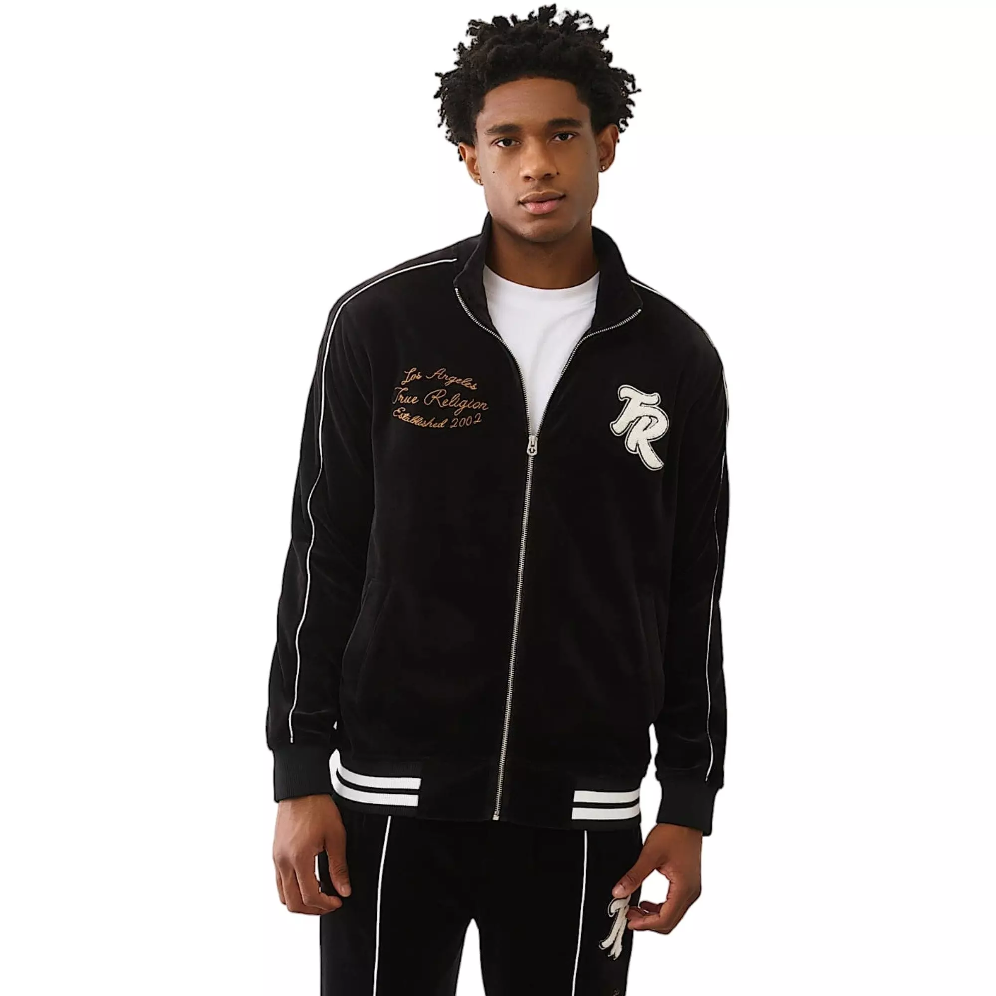Elevate off-duty style with the True Religion Men's Logo Patch Velour Track Jacket, a soft velour layer featuring a zip-front closure and funnel-neck collar. Contrast stitching and varsity-striped rib trim frame the silhouette, while side hand pockets add everyday utility.