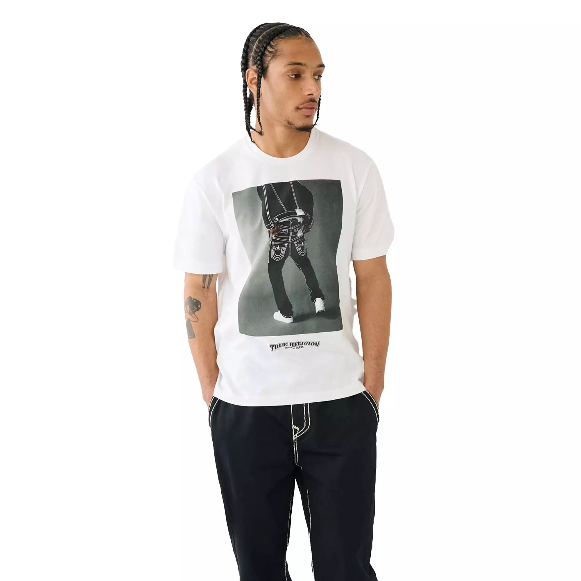 True Religion Men's Photo Graphic Tee-WhiteThe True Religion Men's Photo Graphic Tee is a must-have this season. Crafted from soft cotton, this T-shirt features a crew neck and short sleeves. Finished with a front photo graphic of a True Religion fit and arched logo.