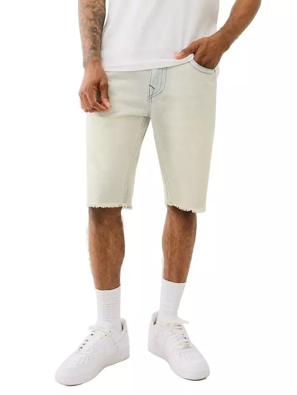 The True Religion Men's Ricky SN Frayed Flap Shorts include blue single needle stitching and signature horseshoe detailing on back flap pockets. Durable construction promises lasting wear and standout style.