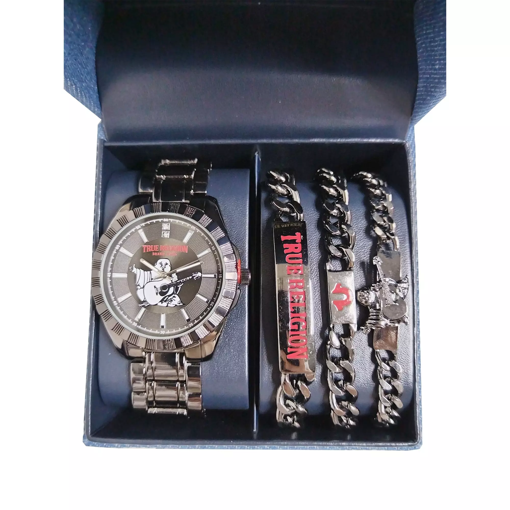 Up your accessory game with this gunmetal True Religion Men's Round Buddha Watch Set. The set includes a dual-toned watch with a Buddha on the dial, plus three stackable silver bracelets engraved with a horseshoe, logo, and Buddha. Wear them together or mix and match for versatile style.Features