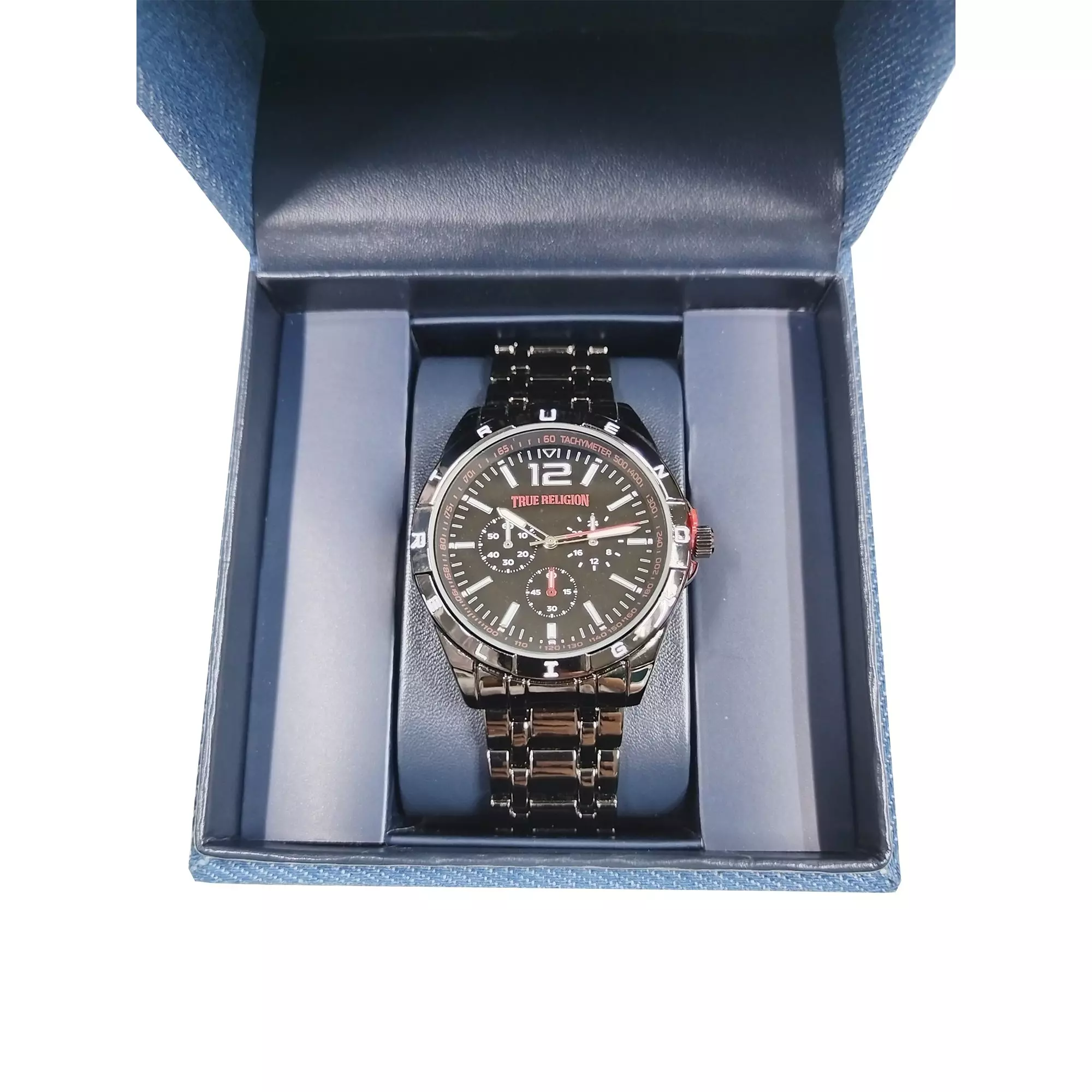 This True Religion Men's Round Logo Bezel Watch - Black features a bold black dial and reliable quartz analog movement, offering timeless style with precision performance.Features