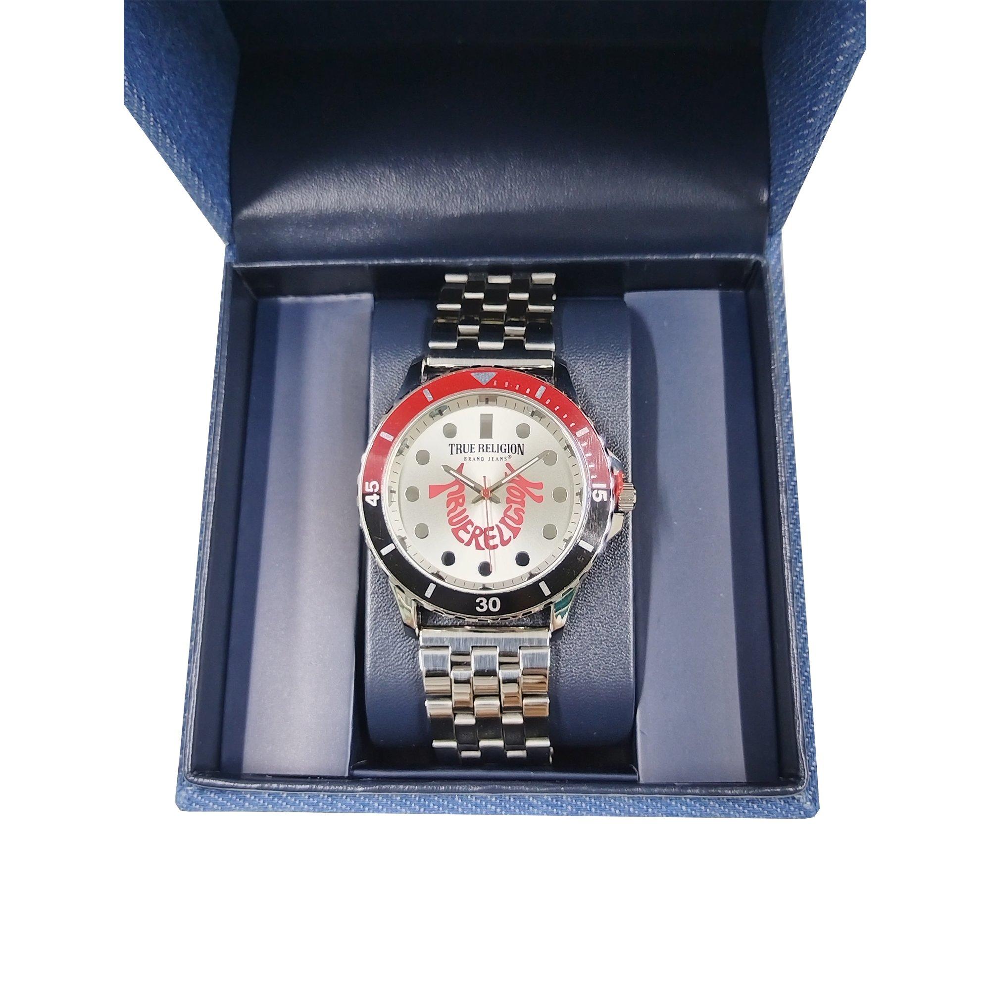 This timeless True Religion Men's Round Two-Tone Bezel Watch - Silver features a round two-tone bezel and a precise analog quartz movement, combining classic design with everyday reliability.