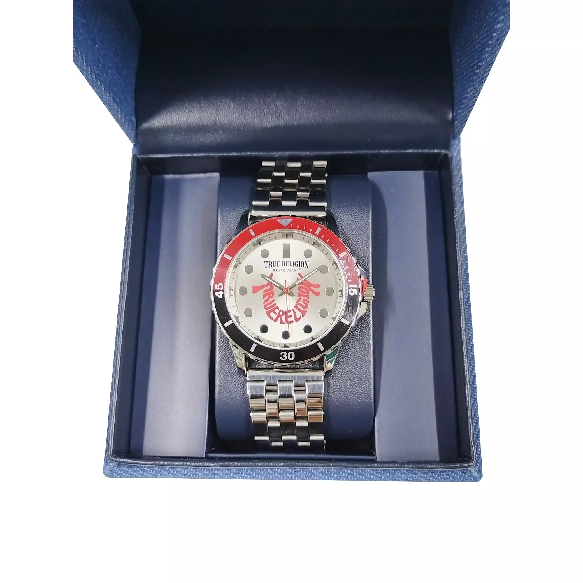 This timeless True Religion Men's Round Two-Tone Bezel Watch - Silver features a round two-tone bezel and a precise analog quartz movement, combining classic design with everyday reliability.Features